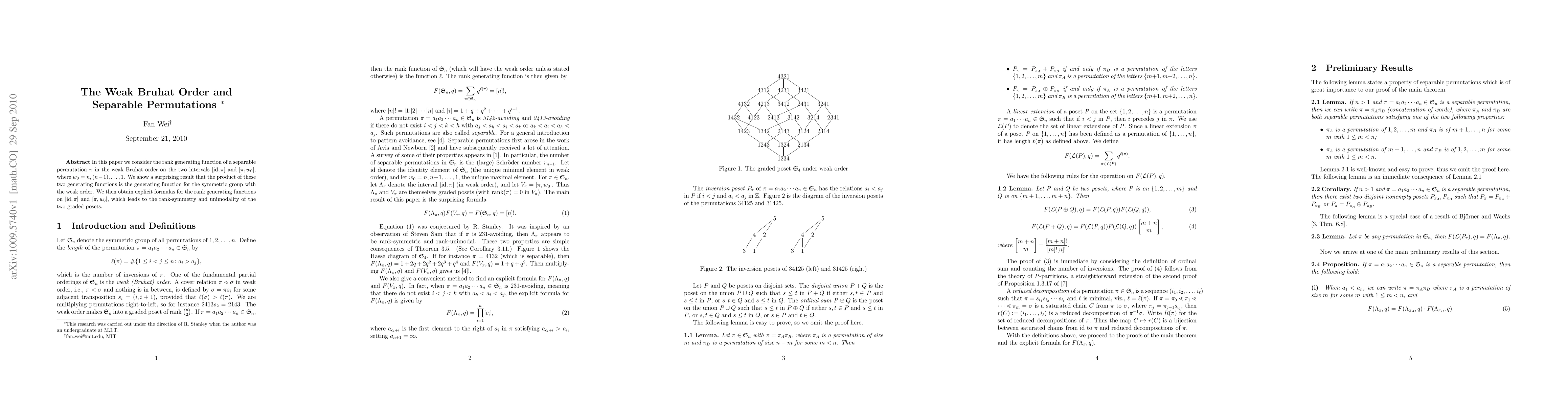 In this paper we consider the rank generating function of a separable permutation $\pi$ in the weak Bruhat order on the two intervals $[\text{id}, \pi]$ and $[\pi, w_0]$, where $w_0 = n,(n-1),..., 1$. We show a surprising result that the product of these two generating functions is the generating function for the symmetric group with the weak order. We then obtain explicit formulas for the rank generating functions on $[\text{id}, \pi]$ and $[\pi, w_0]$, which leads to the rank-symmetry and unimodality of the two graded posets.