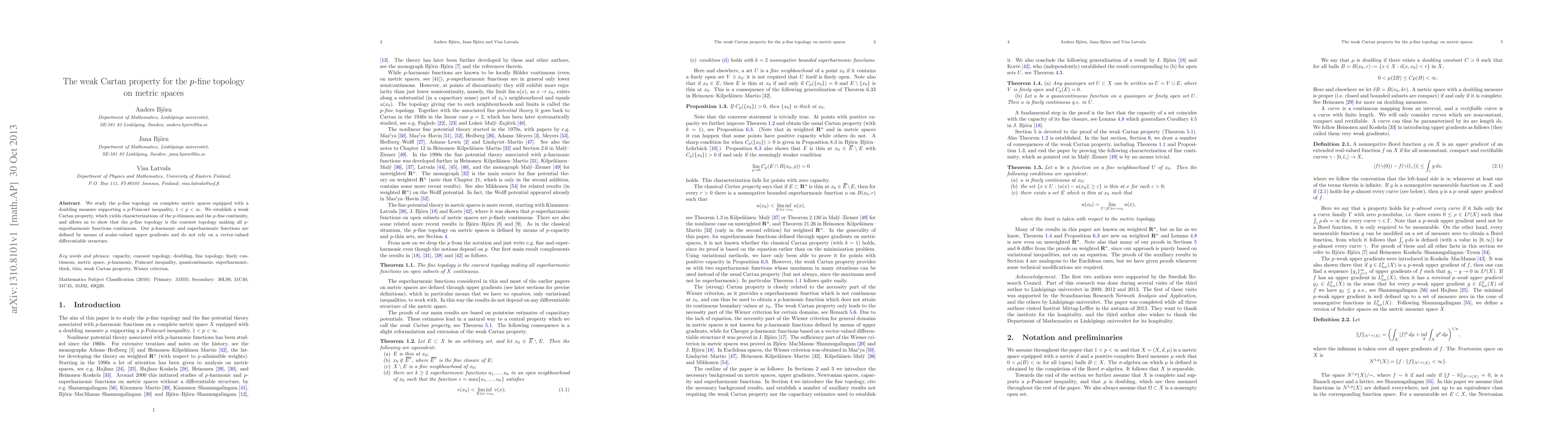 We study the p-fine topology on complete metric spaces equipped with a doubling measure supporting a p-Poincare inequality, 1 < p< oo. We establish a weak Cartan property, which yields characterizations of the p-thinness and the p-fine continuity, and allows us to show that the p-fine topology is the coarsest topology making all p-superharmonic functions continuous. Our p-harmonic and superharmonic functions are defined by means of scalar-valued upper gradients and do not rely on a vector-valued differentiable structure.