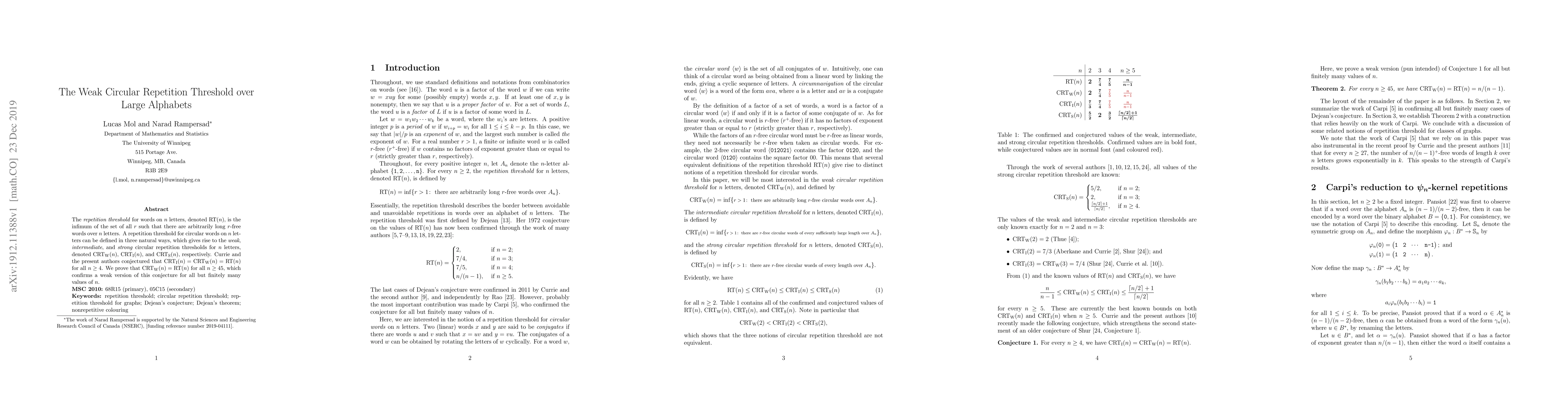 The repetition threshold for words on $n$ letters, denoted $\mbox{RT}(n)$, is the infimum of the set of all $r$ such that there are arbitrarily long $r$-free words over $n$ letters. A repetition threshold for circular words on $n$ letters can be defined in three natural ways, which gives rise to the weak, intermediate, and strong circular repetition thresholds for $n$ letters, denoted $\mbox{CRT}_{\mbox{W}}(n)$, $\mbox{CRT}_{\mbox{I}}(n)$, and $\mbox{CRT}_{\mbox{S}}(n)$, respectively. Currie and the present authors conjectured that $\mbox{CRT}_{\mbox{I}}(n)=\mbox{CRT}_{\mbox{W}}(n)=\mbox{RT}(n)$ for all $n\geq 4$. We prove that $\mbox{CRT}_{\mbox{W}}(n)=\mbox{RT}(n)$ for all $n\geq 45$, which confirms a weak version of this conjecture for all but finitely many values of $n$.