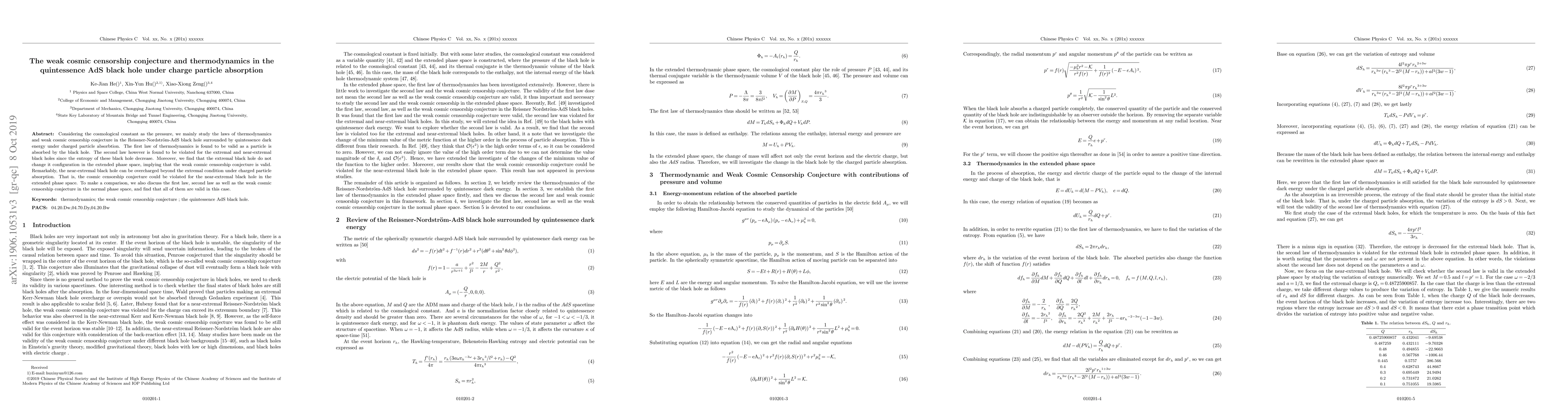The paper presents a detailed analysis of thermodynamic laws and weak cosmic censorship conjecture in the context of AdS black holes with quintessence dark energy, extending previous research by considering charged particle absorption and comparing results in extended versus normal phase spaces.