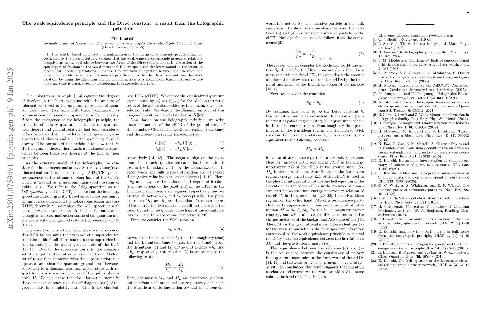 The paper demonstrates that the weak equivalence principle in general relativity is equivalent to the equivalence between two forms of the Dirac constant, using a novel formulation of the holographic principle and a holographic tensor network approach. This equivalence arises from an equation relating Euclidean and Lorentzian world-line actions of a massive particle, incorporating the Dirac constant and quantum mechanical uncertainty relations.