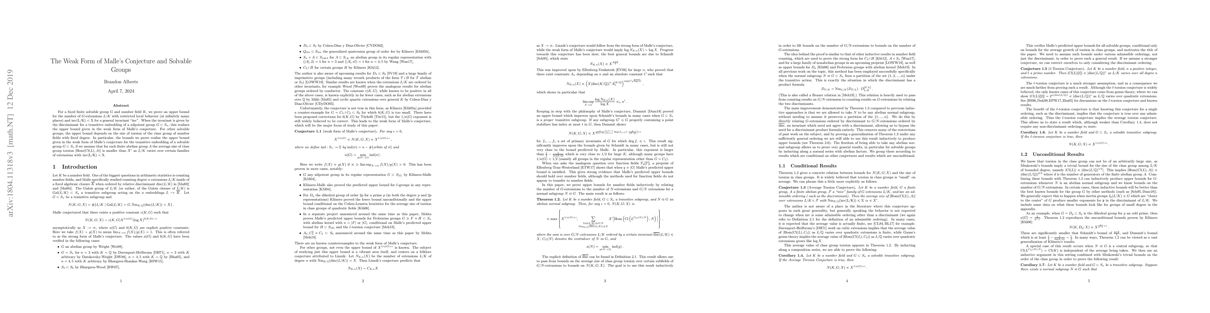 This paper establishes upper bounds for the number of $G$-extensions of a number field $K$ with restricted local behavior, proving results that align with the weak form of Malle's conjecture for solvable groups, particularly when the invariant is the discriminant of a transitive embedding of a nilpotent group $G\subset S_n$. The bounds depend on the size of the torsion in the class group for other solvable groups.