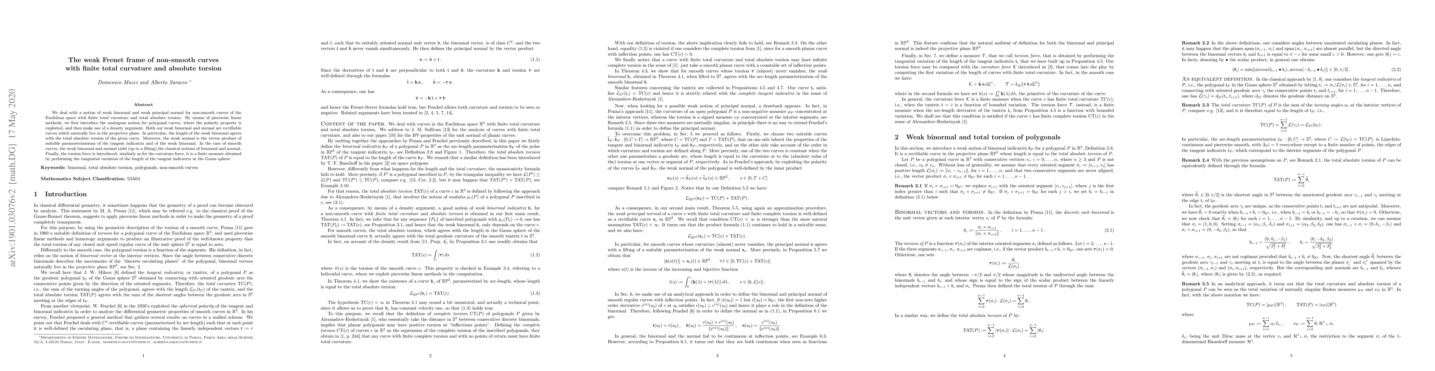We deal with a notion of weak binormal and weak principal normal for non-smooth curves of the Euclidean space with finite total curvature and total absolute torsion. By means of piecewise linear methods, we first introduce the analogous notation for polygonal curves, where the polarity property is exploited, and then make use of a density argument. Both our weak binormal and normal are rectifiable curves which naturally live in the projective plane. In particular, the length of the weak binormal agrees with the total absolute torsion of the given curve. Moreover, the weak normal is the vector product of suitable parameterizations of the tangent indicatrix and of the weak binormal. In the case of smooth curves with positive curvature, the weak binormal and normal yield (up to a lifting) the classical notions of binormal and normal.