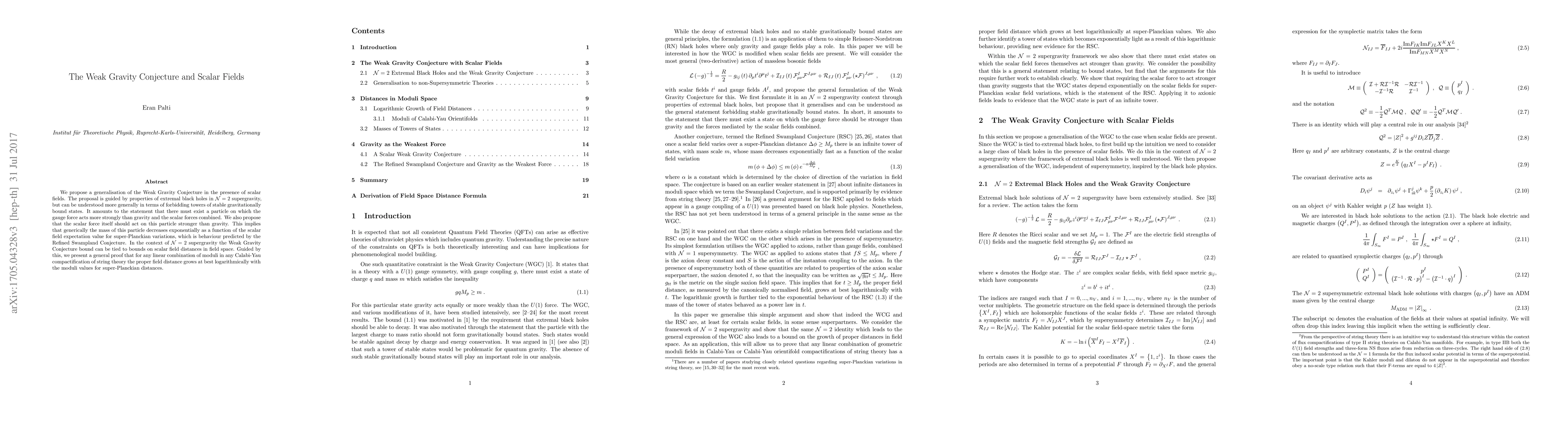 This paper generalizes the Weak Gravity Conjecture to include scalar fields, asserting that a particle must exist where gauge forces dominate both gravity and scalar forces. It also ties this conjecture to the Refined Swampland Conjecture and shows that in ${\cal N}=2$ supergravity, the proper field distance for moduli in string theory compactifications grows at most logarithmically for super-Planckian variations.
