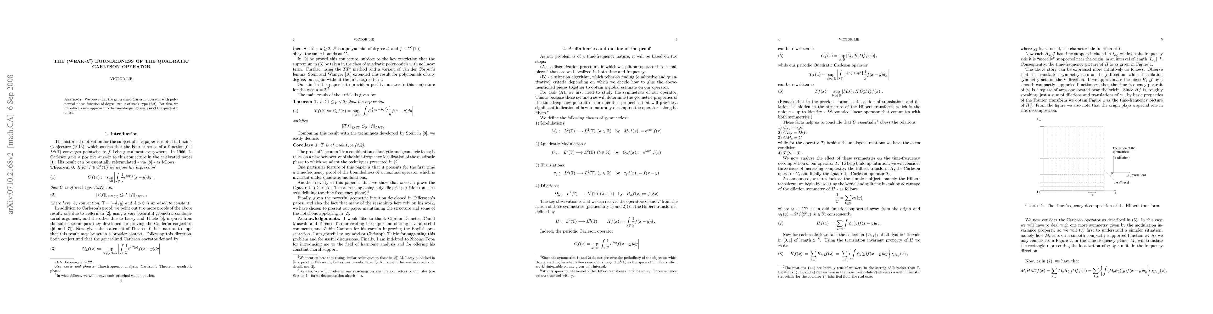 We prove that the generalized Carleson operator with polynomial phase function of degree two is of weak type (2,2). For this, we introduce a new approach to the time-frequency analysis of the quadratic phase.