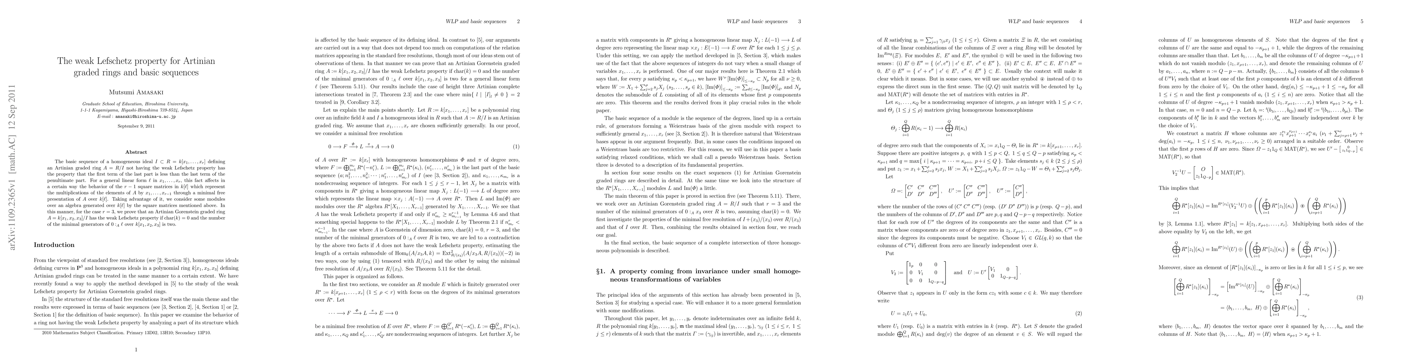 This paper investigates the weak Lefschetz property in Artinian graded rings defined by homogeneous ideals, focusing on the behavior of basic sequences when the property is absent. The study reveals that for a specific linear form, the arrangement of certain square matrices influences the multiplication of elements in the ring. For $r=3$, the paper demonstrates that an Artinian graded ring has the weak Lefschetz property if the characteristic of the field is zero and the minimal generators of $0:_A\ell$ are two.
