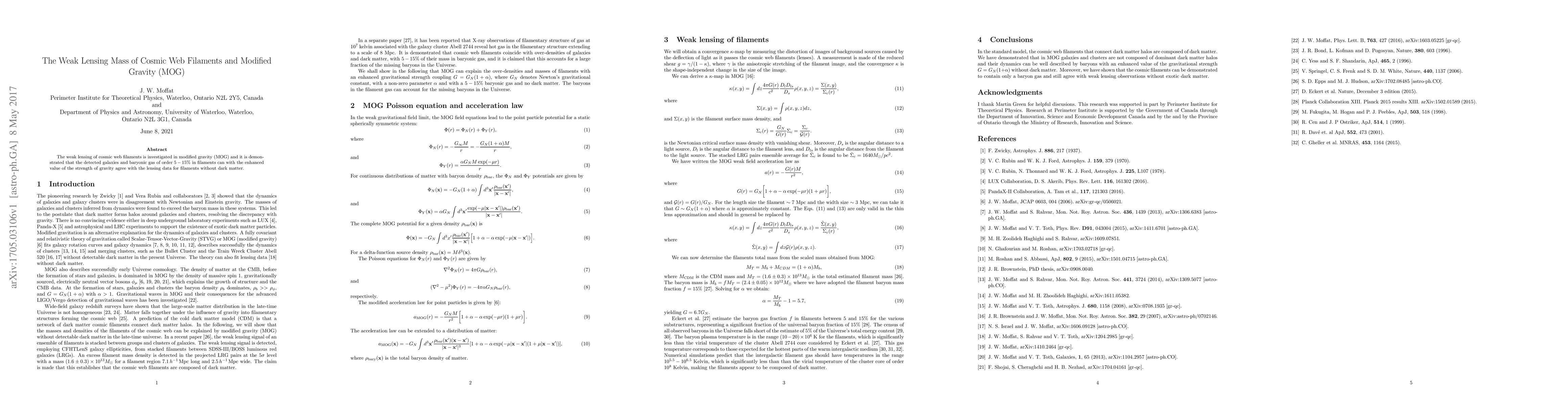 The weak lensing of cosmic web filaments is investigated in modified gravity (MOG) and it is demonstrated that the detected galaxies and baryonic gas of order $5-15 \%$ in filaments can with the enhanced value of the strength of gravity agree with the lensing data for filaments without dark matter.