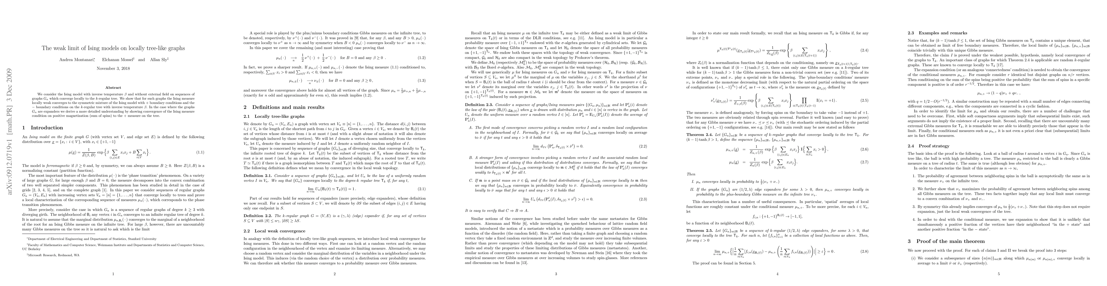 This paper investigates the Ising model on sequences of locally tree-like graphs converging to a k-regular tree, demonstrating weak convergence of the Ising measure to a symmetric mixture of Ising models on the tree. For expander graphs, it further shows convergence of the positive magnetization condition to the + measure on the tree.