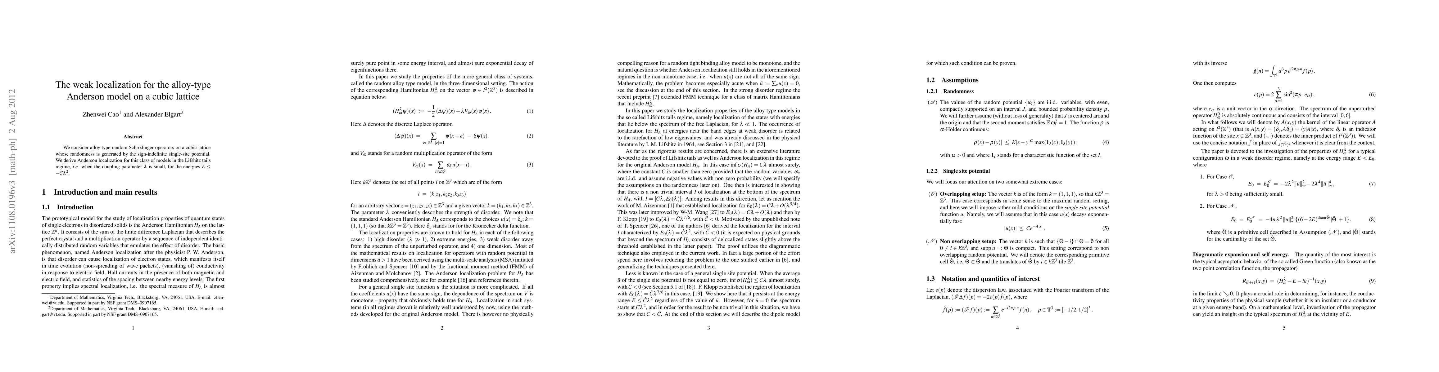 Summary: This paper investigates alloy-type random Schrödinger operators on a cubic lattice, deriving Anderson localization in the Lifshitz tails regime for small coupling parameters, demonstrating localization effects for energies below a certain threshold.