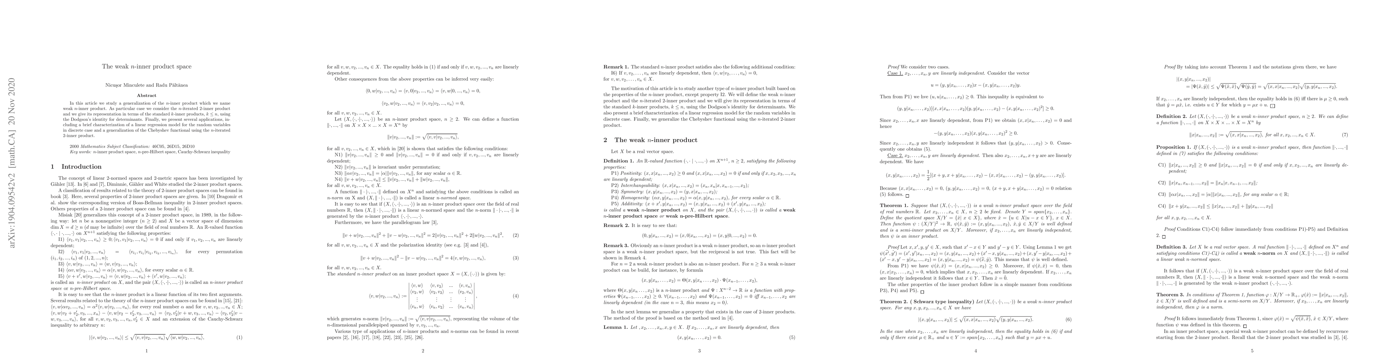 This paper generalizes the concept of the n-inner product to a "weak n-inner product," specifically examining the n-iterated 2-inner product. It utilizes Dodgson's identity for determinants to represent this generalization in terms of standard k-inner products, and explores applications including a discrete linear regression model and a Chebyshev functional generalization.