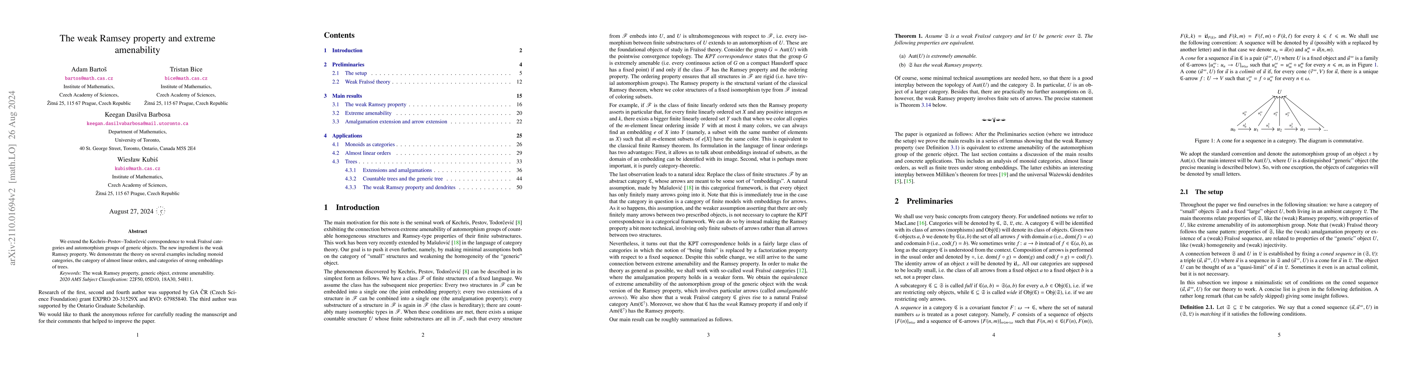 Researchers extended a correspondence theory to weak Fraéssé categories and automorphism groups of generic objects, leveraging the weak Ramsey property to demonstrate its application in various category examples.