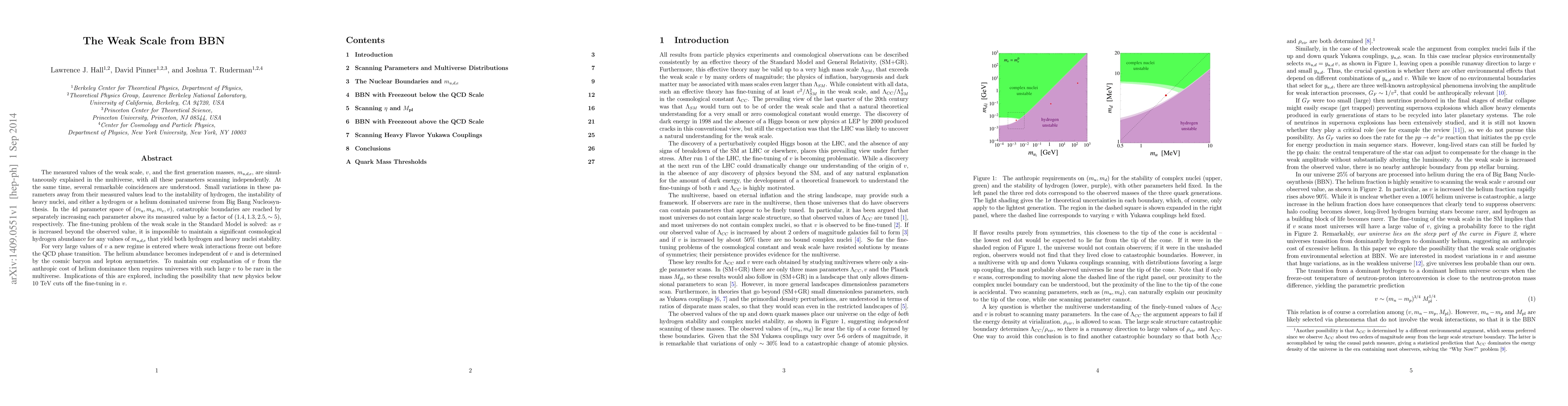 The measured values of the weak scale, $v$, and the first generation masses, $m_{u,d,e}$, are simultaneously explained in the multiverse, with all these parameters scanning independently. At the same time, several remarkable coincidences are understood. Small variations in these parameters away from their measured values lead to the instability of hydrogen, the instability of heavy nuclei, and either a hydrogen or a helium dominated universe from Big Bang Nucleosynthesis. In the 4d parameter space of $(m_u,m_d,m_e,v)$, catastrophic boundaries are reached by separately increasing each parameter above its measured value by a factor of $(1.4,1.3,2.5,\sim5)$, respectively. The fine-tuning problem of the weak scale in the Standard Model is solved: as $v$ is increased beyond the observed value, it is impossible to maintain a significant cosmological hydrogen abundance for any values of $m_{u,d,e}$ that yield both hydrogen and heavy nuclei stability. For very large values of $v$ a new regime is entered where weak interactions freeze out before the QCD phase transition. The helium abundance becomes independent of $v$ and is determined by the cosmic baryon and lepton asymmetries. To maintain our explanation of $v$ from the anthropic cost of helium dominance then requires universes with such large $v$ to be rare in the multiverse. Implications of this are explored, including the possibility that new physics below 10 TeV cuts off the fine-tuning in $v$.