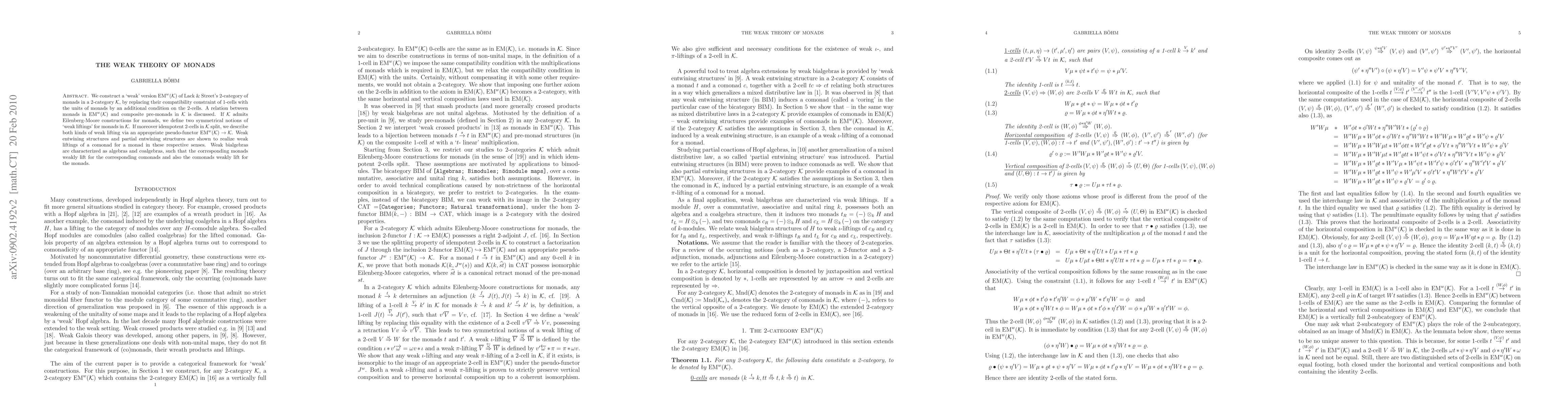 This paper constructs a "weak" version of monads in a 2-category K, termed EM^w(K), and explores relationships between monads in this structure and composite pre-monads in K. It also defines "weak liftings" for monads under certain conditions and characterizes weak bialgebras as structures that allow for such liftings.
