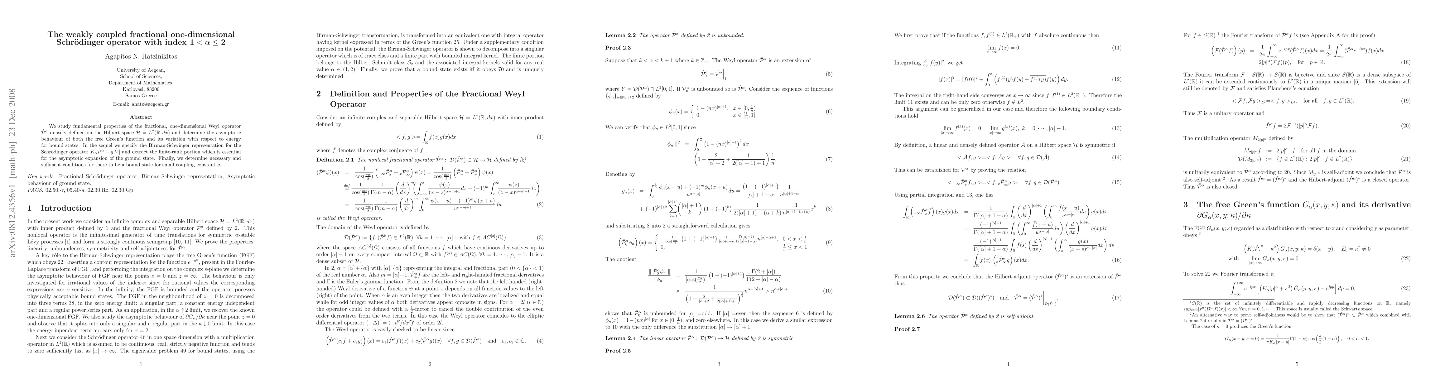 We study fundamental properties of the fractional, one-dimensional Weyl operator $\hat{\mathcal{P}}^{\alpha}$ densely defined on the Hilbert space $\mathcal{H}=L^2({\mathbb R},dx)$ and determine the asymptotic behaviour of both the free Green's function and its variation with respect to energy for bound states. In the sequel we specify the Birman-Schwinger representation for the Schr\"{o}dinger operator $K_{\alpha}\hat{\mathcal{P}}^{\alpha}-g|\hat{V}|$ and extract the finite-rank portion which is essential for the asymptotic expansion of the ground state. Finally, we determine necessary and sufficient conditions for there to be a bound state for small coupling constant $g$.