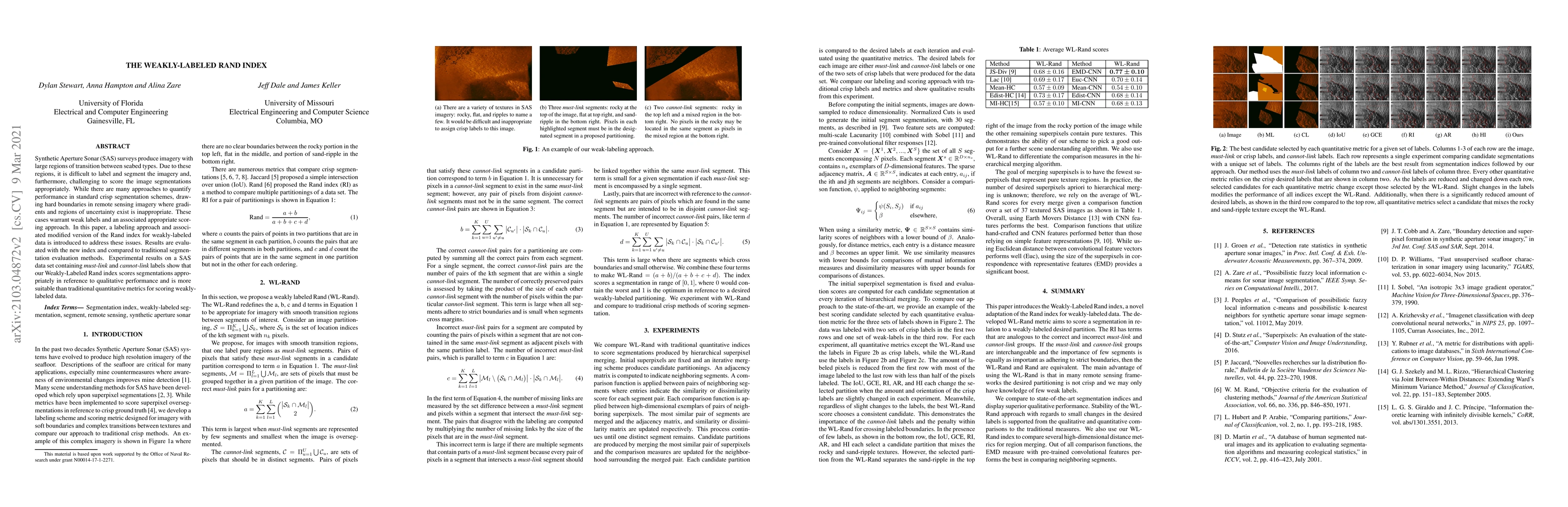 Synthetic Aperture Sonar (SAS) surveys produce imagery with large regions of transition between seabed types. Due to these regions, it is difficult to label and segment the imagery and, furthermore, challenging to score the image segmentations appropriately. While there are many approaches to quantify performance in standard crisp segmentation schemes, drawing hard boundaries in remote sensing imagery where gradients and regions of uncertainty exist is inappropriate. These cases warrant weak labels and an associated appropriate scoring approach. In this paper, a labeling approach and associated modified version of the Rand index for weakly-labeled data is introduced to address these issues. Results are evaluated with the new index and compared to traditional segmentation evaluation methods. Experimental results on a SAS data set containing must-link and cannot-link labels show that our Weakly-Labeled Rand index scores segmentations appropriately in reference to qualitative performance and is more suitable than traditional quantitative metrics for scoring weakly-labeled data.
