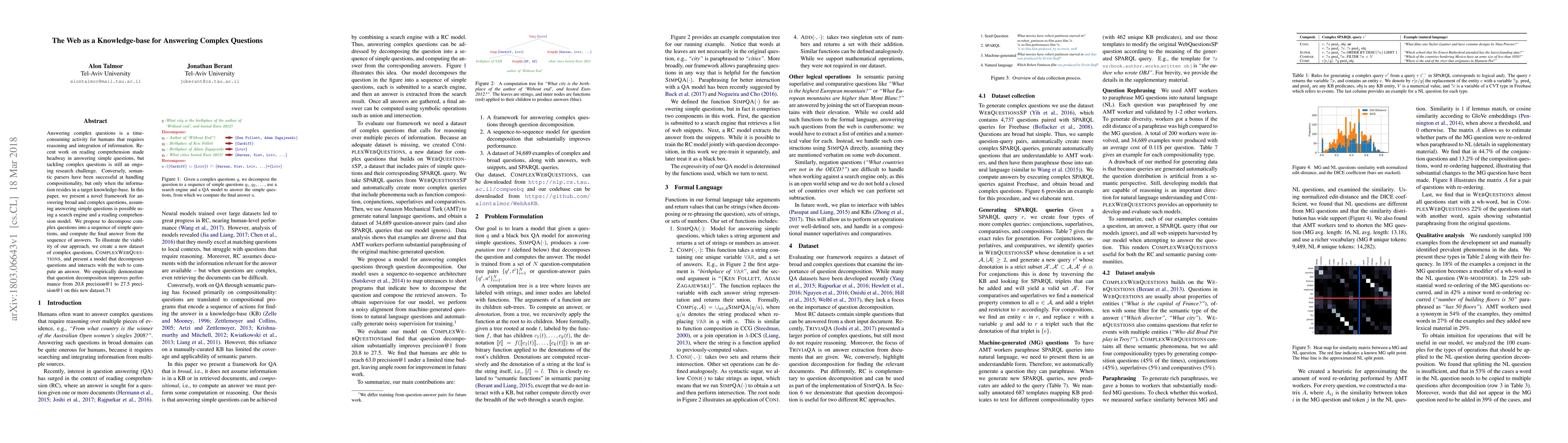 This paper introduces a framework for answering complex questions using web-based knowledge, decomposing them into simpler questions, and integrating their answers. The proposed model, tested on a new dataset, shows improved performance, achieving higher precision by breaking down complex queries.