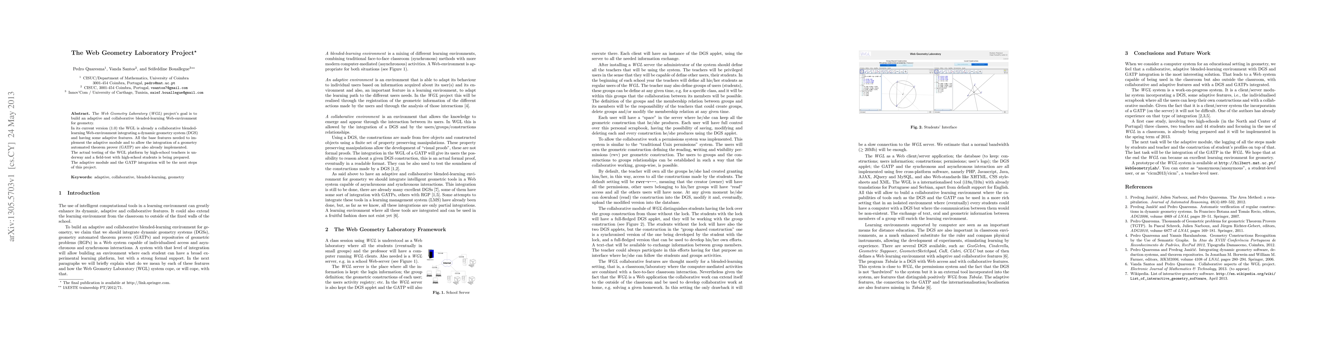 The "Web Geometry Laboratory" (WGL) project's goal is to build an adaptive and collaborative blended-learning Web-environment for geometry. In its current version (1.0) the WGL is already a collaborative blended-learning Web-environment integrating a dynamic geometry system (DGS) and having some adaptive features. All the base features needed to implement the adaptive module and to allow the integration of a geometry automated theorem prover (GATP) are also already implemented. The actual testing of the WGL platform by high-school teachers is underway and a field-test with high-school students is being prepared. The adaptive module and the GATP integration will be the next steps of this project.