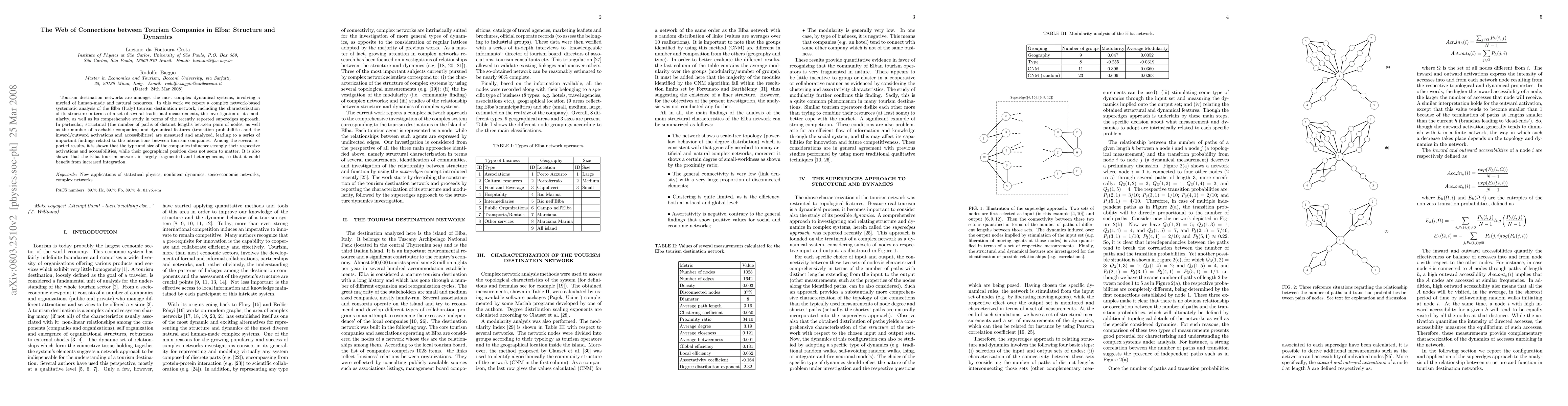 Tourism destination networks are amongst the most complex dynamical systems, involving a myriad of human-made and natural resources. In this work we report a complex network-based systematic analysis of the Elba (Italy) tourism destination network, including the characterization of its structure in terms of a set of several traditional measurements, the investigation of its modularity, as well as its comprehensive study in terms of the recently reported superedges approach. In particular, structural (the number of paths of distinct lengths between pairs of nodes, as well as the number of reachable companies) and dynamical features (transition probabilities and the inward/outward activations and accessibilities) are measured and analyzed, leading to a series of important findings related to the interactions between tourism companies. Among the several reported results, it is shown that the type and size of the companies influence strongly their respective activations and accessibilities, while their geographical position does not seem to matter. It is also shown that the Elba tourism network is largely fragmented and heterogeneous, so that it could benefit from increased integration.
