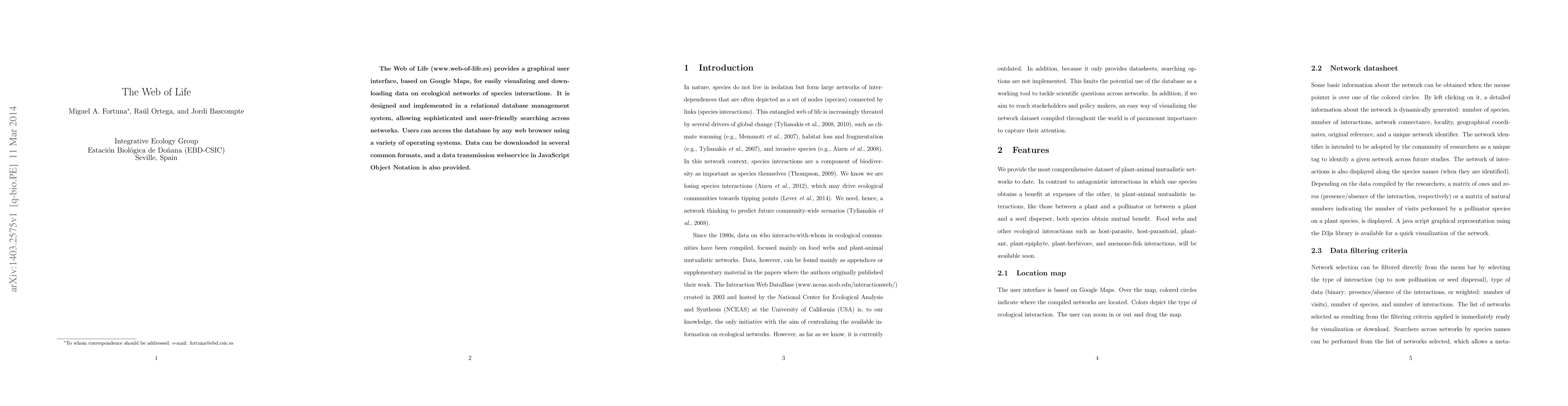 The Web of Life (www.web-of-life.es) provides a graphical user interface, based on Google Maps, for easily visualizing and downloading data on ecological networks of species interactions. It is designed and implemented in a relational database management system, allowing sophisticated and user-friendly searching across networks. Users can access the database by any web browser using a variety of operating systems. Data can be downloaded in several common formats, and a data transmission webservice in JavaScript Object Notation is also provided.