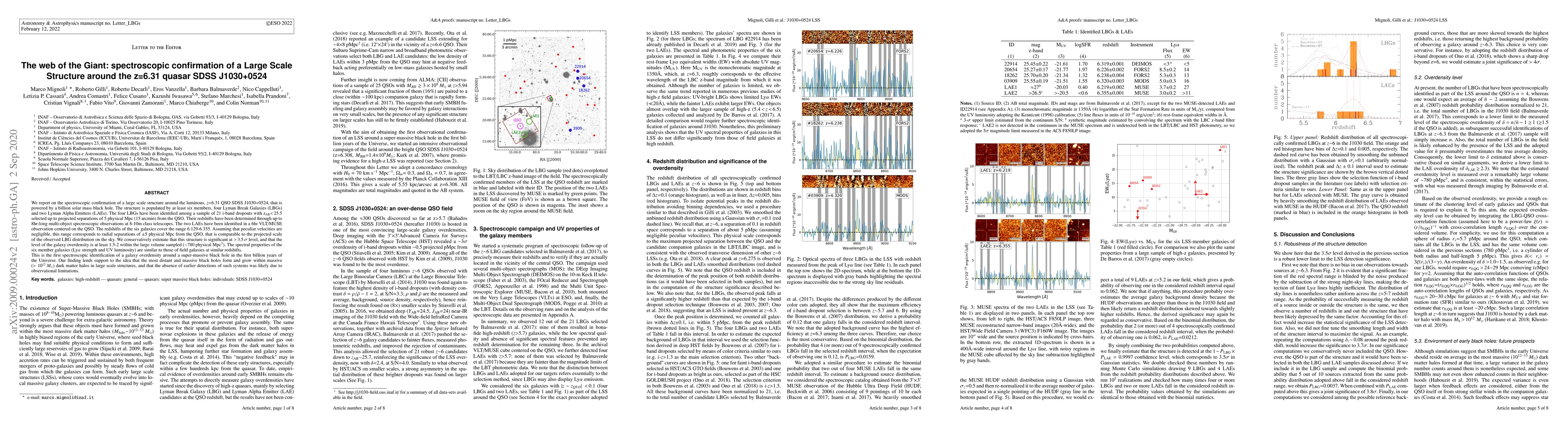 We report on the spectroscopic confirmation of a large scale structure around the luminous, z=6.31 QSO SDSS~J1030+0524, that is powered by a billion solar mass black hole. The structure is populated by at least six members, four Lyman Break Galaxies (LBGs) and two Lyman Alpha Emitters (LAEs). The four LBGs have been identified among a sample of 21 i-band dropouts with z{AB}<25.5 selected up to projected separations of 5 physical Mpc (15 arcmin) from the QSO. Their redshifts have been determined through up to 8hr-long multi-object spectroscopic observations at 8-10m class telescopes. The two LAEs have been identified in a 6hr VLT/MUSE observation centered on the QSO. The redshifts of the six galaxies cover the range 6.129-6.355. Assuming that peculiar velocities are negligible, this range corresponds to radial separations of +/-5 physical Mpc from the QSO, that is comparable to the projected scale of the observed LBG distribution on the sky. We conservatively estimate that this structure is significant at >3.5 sigma level, and that the level of the galaxy overdensity is at least 1.5-2 within the large volume sampled (~780 physical Mpc^3). The spectral properties of the six member galaxies (Lyalpha strength and UV luminosity) are similar to those of field galaxies at similar redshifts. This is the first spectroscopic identification of a galaxy overdensity around a super-massive black hole in the first billion years of the Universe. Our finding lends support to the idea that the most distant and massive black holes form and grow within massive (>10^{12} Msun) dark matter halos in large scale structures, and that the absence of earlier detections of such systems was likely due to observational limitations.