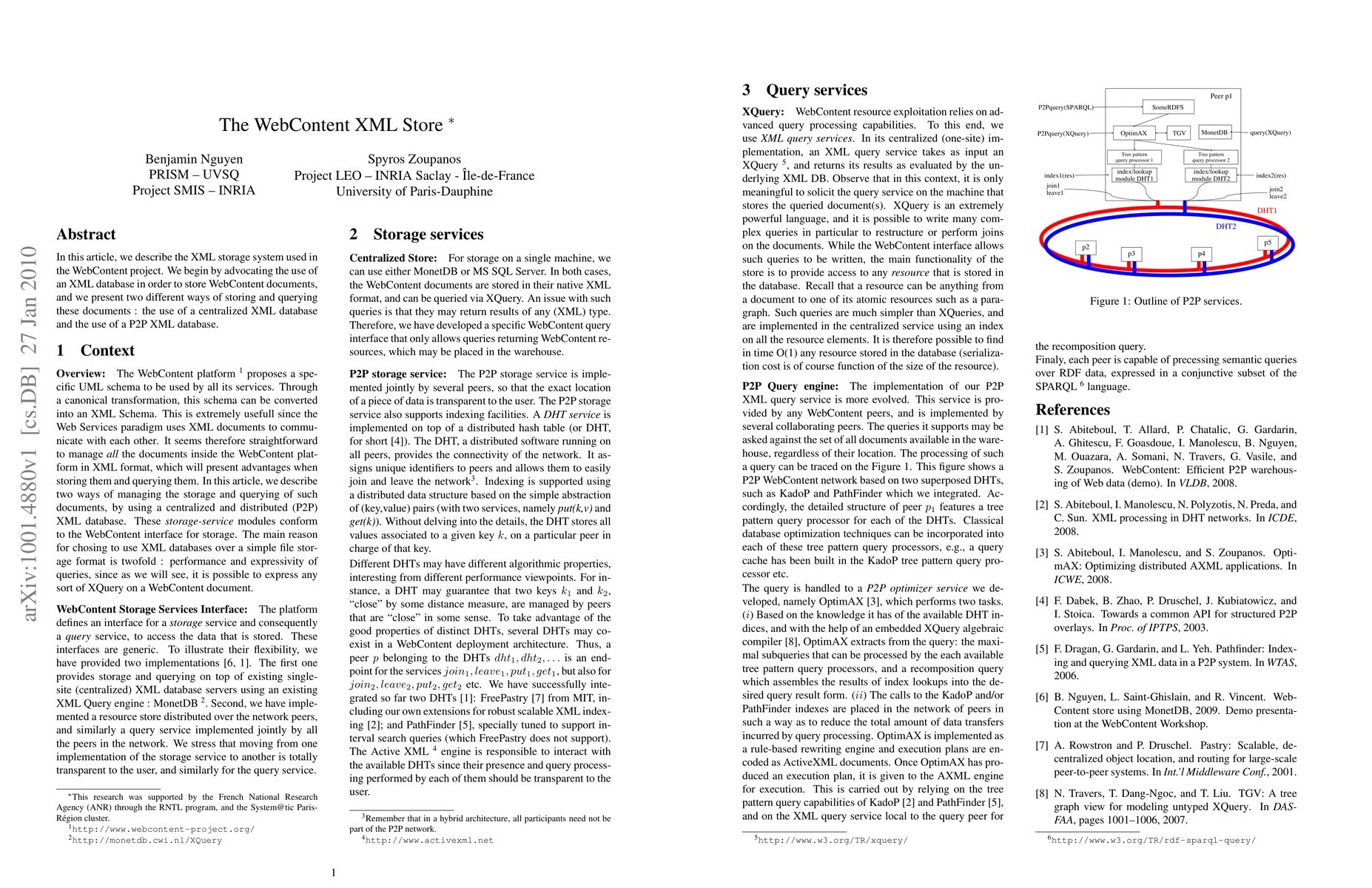 Summary: This article advocates for the use of XML databases in the WebContent project, presenting two storage methods: a centralized XML database and a peer-to-peer (P2P) XML database for storing and querying WebContent documents.