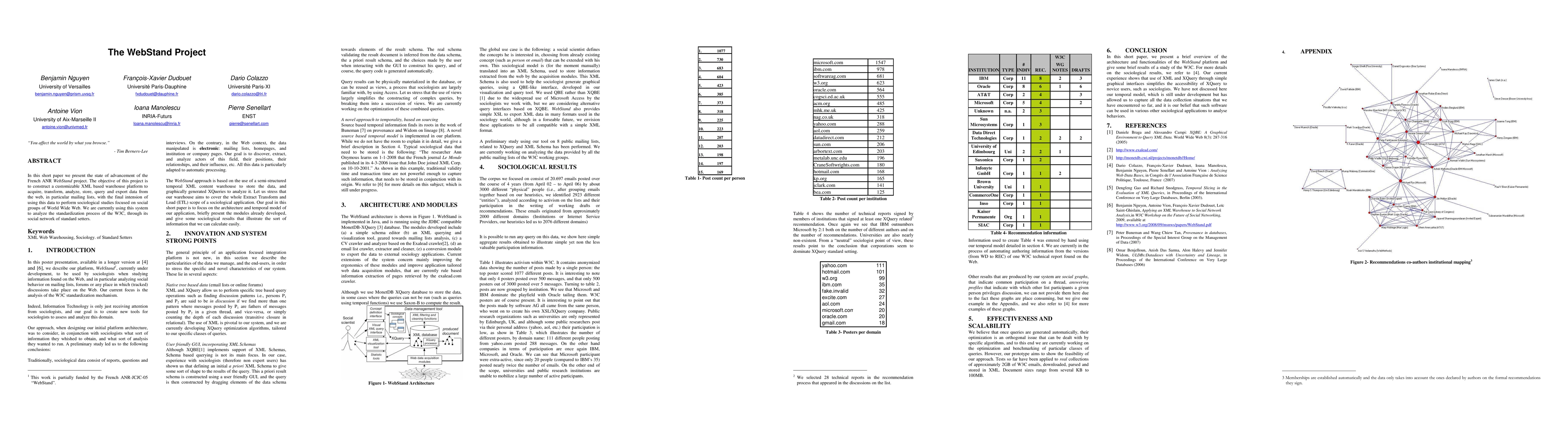 The WebStand project aims to create a customizable XML-based platform for analyzing data from online sources, with initial focus on the W3C's social network of standard setters. The project's goal is to enable sociological studies on social groups within the World Wide Web, particularly in relation to temporal aspects of data.