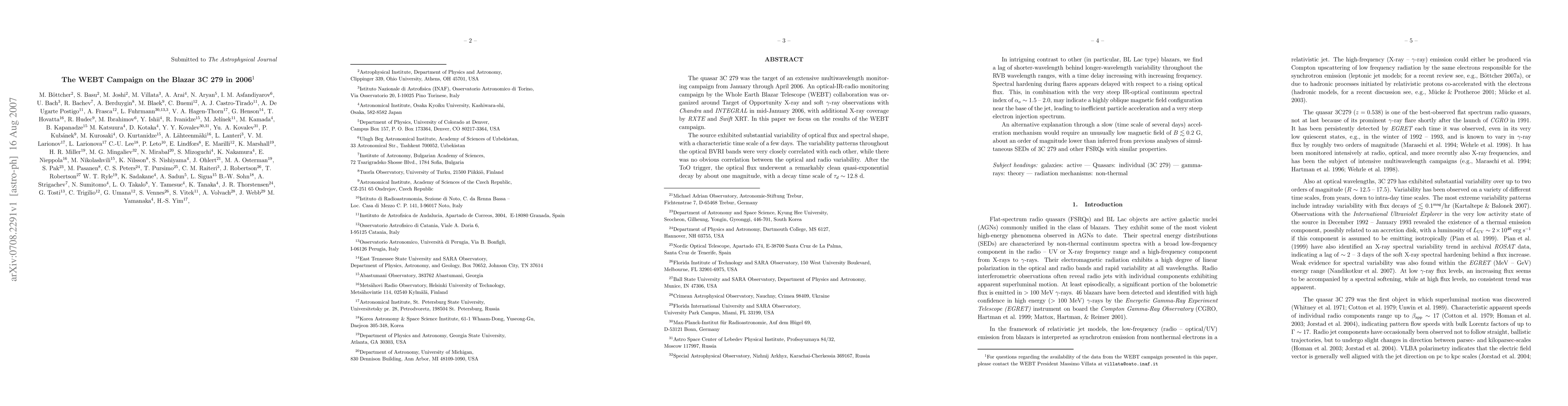 The quasar 3C279 was the target of an extensive multiwavelength monitoring campaign from January through April 2006, including an optical-IR-radio monitoring campaign by the Whole Earth Blazar Telescope (WEBT) collaboration. In this paper we focus on the results of the WEBT campaign. The source exhibited substantial variability of optical flux and spectral shape, with a characteristic time scale of a few days. The variability patterns throughout the optical BVRI bands were very closely correlated with each other. In intriguing contrast to other (in particular, BL Lac type) blazars, we find a lag of shorter- behind longer-wavelength variability throughout the RVB ranges, with a time delay increasing with increasing frequency. Spectral hardening during flares appears delayed with respect to a rising optical flux. This, in combination with the very steep IR-optical continuum spectral index of ~ 1.5 - 2.0, may indicate a highly oblique magnetic field configuration near the base of the jet. An alternative explanation through a slow (time scale of several days) acceleration mechanism would require an unusually low magnetic field of < 0.2 G, about an order of magnitude lower than inferred from previous analyses of simultaneous SEDs of 3C279 and other FSRQs with similar properties.