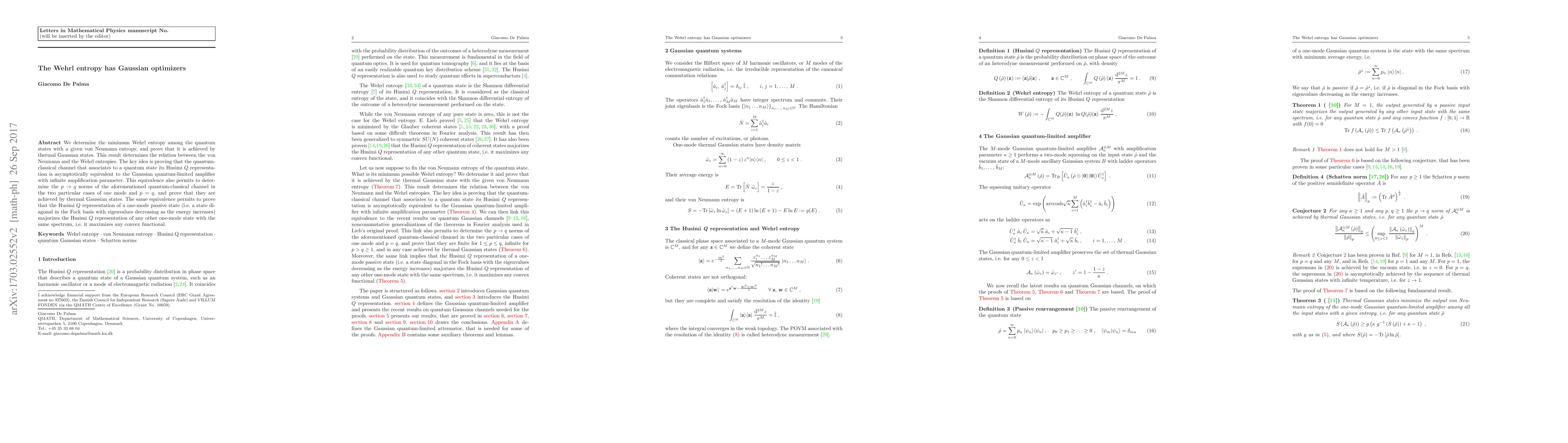This paper establishes that the minimum Wehrl entropy among quantum states with a fixed von Neumann entropy is achieved by thermal Gaussian states. It demonstrates the asymptotic equivalence between the quantum-classical channel and a Gaussian quantum-limited amplifier, which helps determine specific norms and proves that thermal Gaussian states maximize convex functionals.