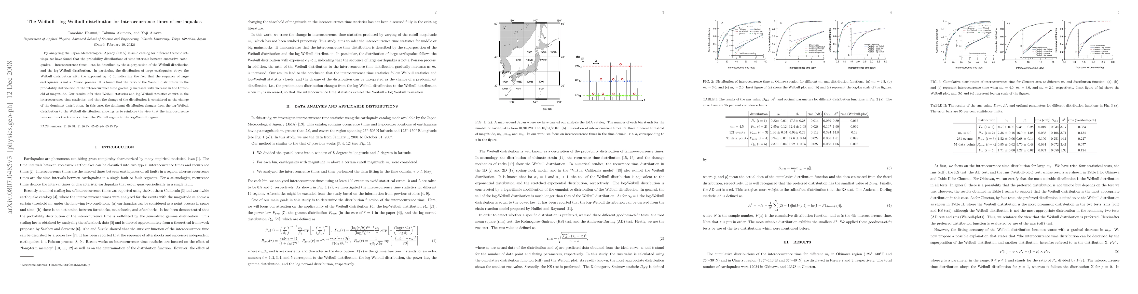 This study reveals that interoccurrence times between earthquakes in Japan can be modeled by the superposition of Weibull and log-Weibull distributions, with large earthquakes following a Weibull distribution indicating a non-Poisson process. The transition from log-Weibull to Weibull dominance with increasing earthquake magnitude suggests a shift in the governing distribution.