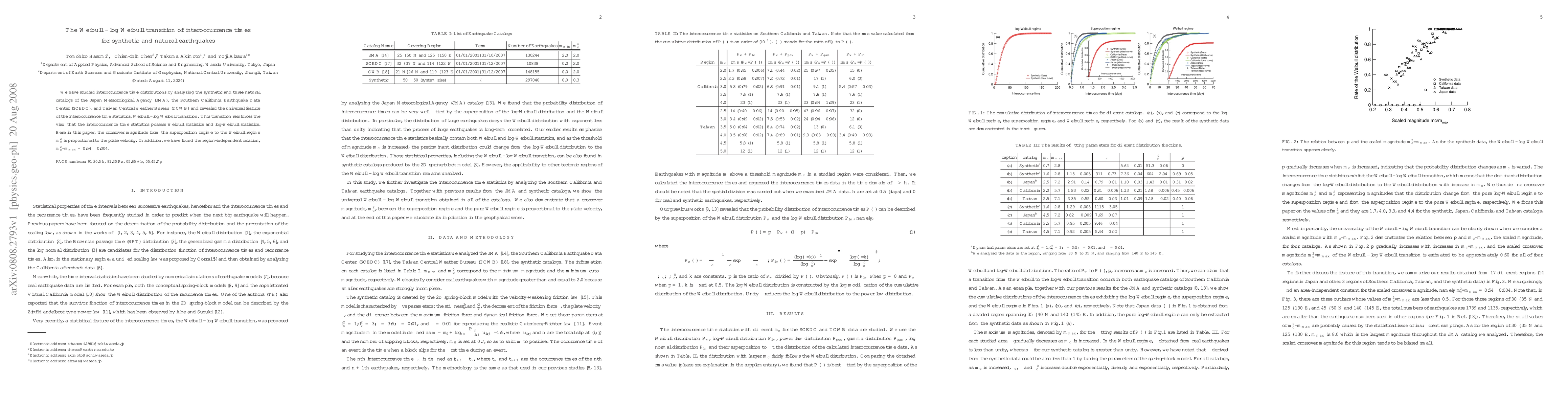 This paper investigates interoccurrence time distributions in synthetic and natural earthquake catalogs, revealing a Weibull-log Weibull transition. The study found that the crossover magnitude from the superposition regime to the Weibull regime is proportional to plate velocity, and identified a region-independent relation of $m_c^2/m_{max} = 0.54 \pm 0.004$.