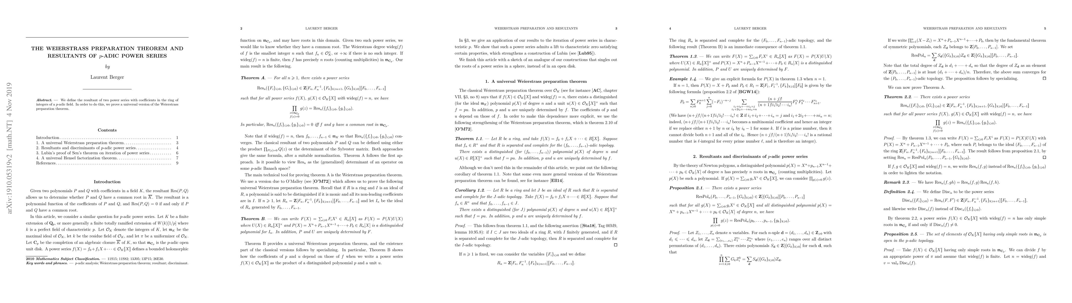 Summary: This paper defines the resultant for $p$-adic power series by proving a universal version of the Weierstrass preparation theorem, which facilitates the analysis of these series within the context of $p$-adic fields.