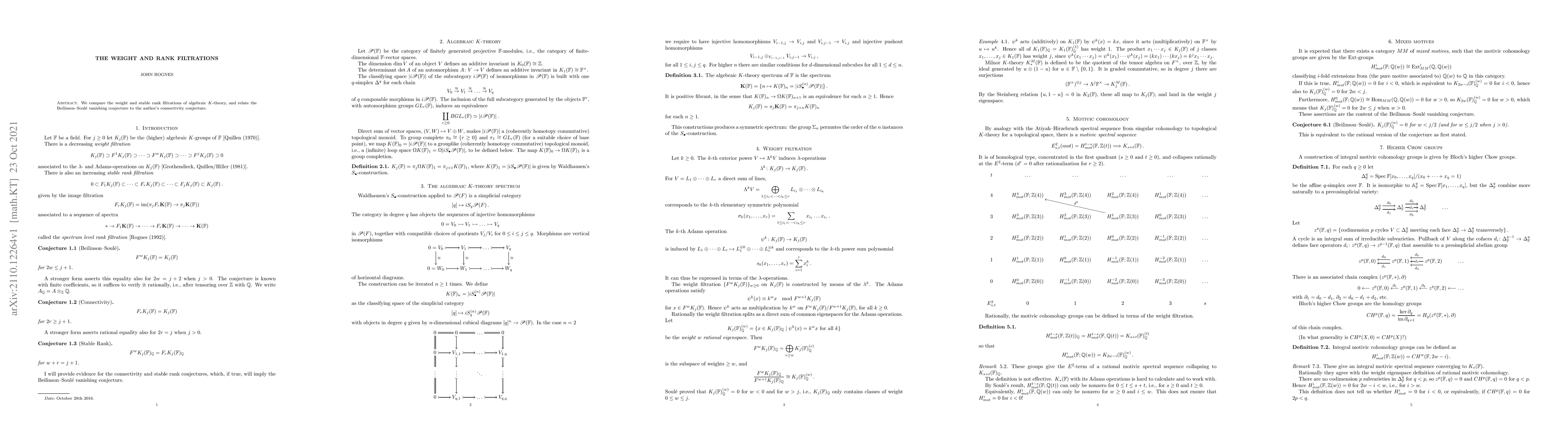 This paper compares the weight and stable rank filtrations in algebraic K-theory, establishing connections between the Beilinson-Soulé vanishing conjecture and the author's connectivity conjecture.