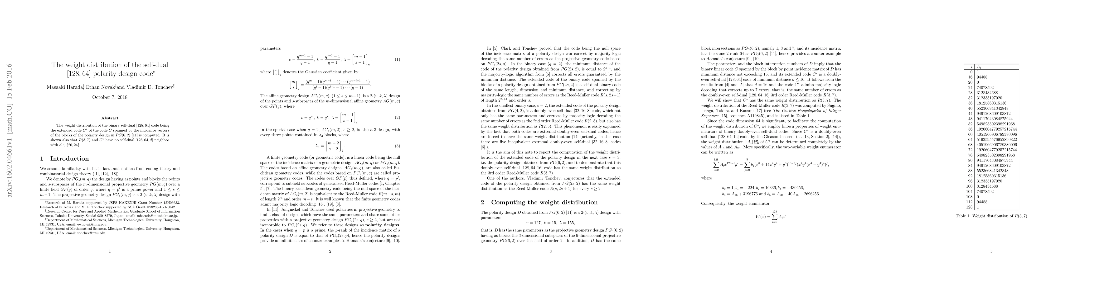 The weight distribution of the binary self-dual $[128,64]$ code being the extended code $C^{*}$ of the code $C$ spanned by the incidence vectors of the blocks of the polarity design in $PG(6,2)$ [11] is computed. It is shown also that $R(3,7)$ and $C^{*}$ have no self-dual $[128,64,d]$ neighbor with $d \in \{ 20, 24 \}$.