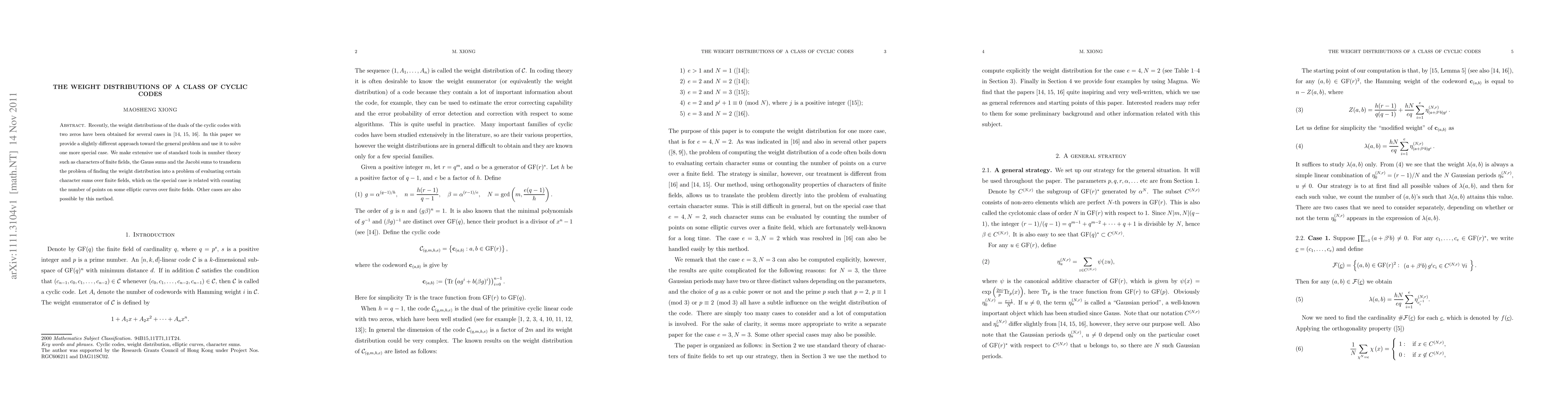 This paper presents a novel approach to determining the weight distributions of cyclic codes using number theory tools like characters, Gauss sums, and Jacobi sums, successfully solving an additional special case related to elliptic curves over finite fields. The method is applicable to other cases as well.
