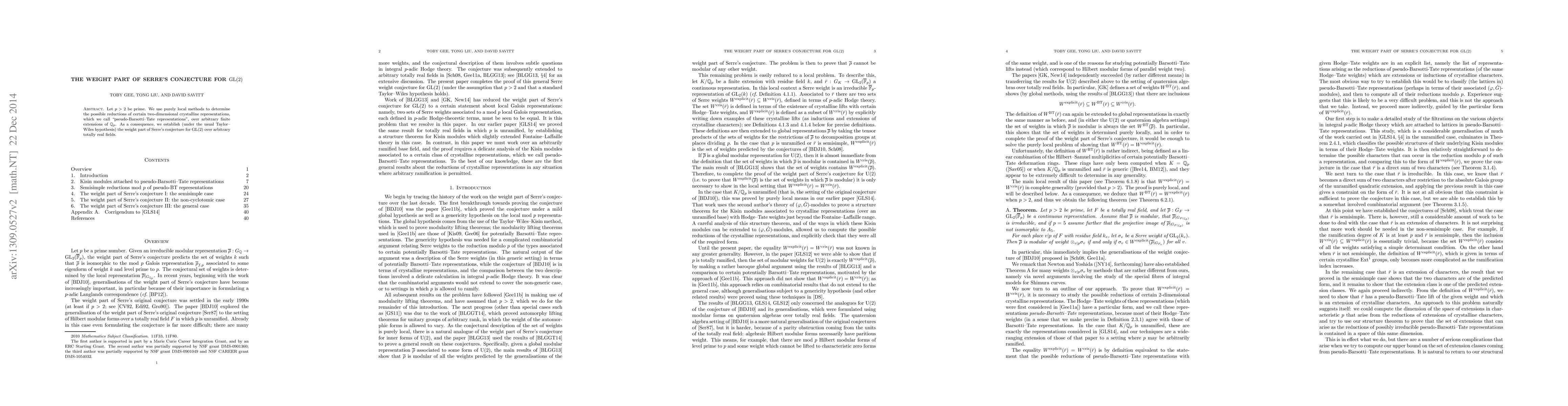 Let p > 2 be prime. We use purely local methods to determine the possible reductions of certain two-dimensional crystalline representations, which we call "pseudo-Barsotti-Tate representations", over arbitrary finite extensions of the p-adics. As a consequence, we establish (under the usual Taylor-Wiles hypothesis) the weight part of Serre's conjecture for GL(2) over arbitrary totally real fields.