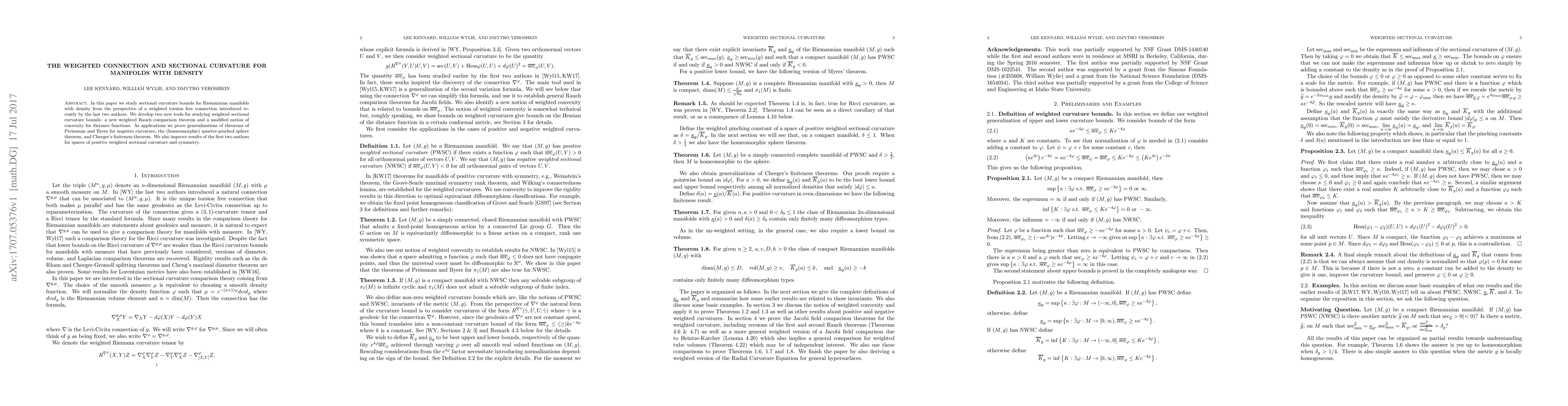 In this paper we study sectional curvature bounds for Riemannian manifolds with density from the perspective of a weighted torsion free connection introduced recently by the last two authors. We develop two new tools for studying weighted sectional curvature bounds: a new weighted Rauch comparison theorem and a modified notion of convexity for distance functions. As applications we prove generalizations of theorems of Preissman and Byers for negative curvature, the (homeomorphic) quarter-pinched sphere theorem, and Cheeger's finiteness theorem. We also improve results of the first two authors for spaces of positive weighted sectional curvature and symmetry.