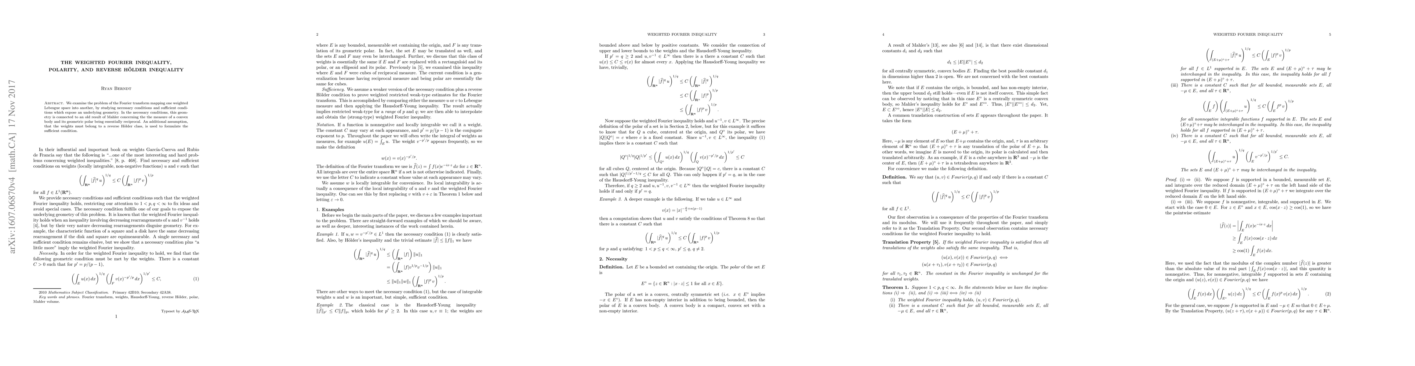 This paper investigates how the Fourier transform maps weighted Lebesgue spaces, finding necessary and sufficient conditions for this mapping, and linking these to a geometric property related to convex sets and their polar measures.