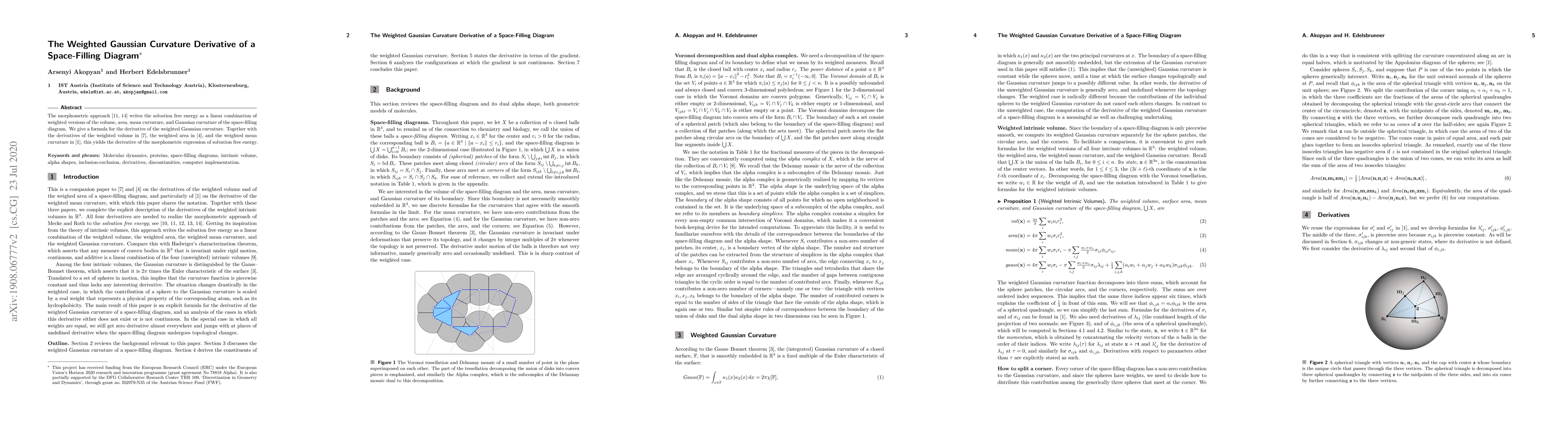 The morphometric approach [HRC13,RHK06] writes the solvation free energy as a linear combination of weighted versions of the volume, area, mean curvature, and Gaussian curvature of the space-filling diagram. We give a formula for the derivative of the weighted Gaussian curvature. Together with the derivatives of the weighted volume in [EdKo03], the weighted area in [BEKL04], and the weighted mean curvature in [AkEd19], this yields the derivative of the morphometric expression of solvation free energy.