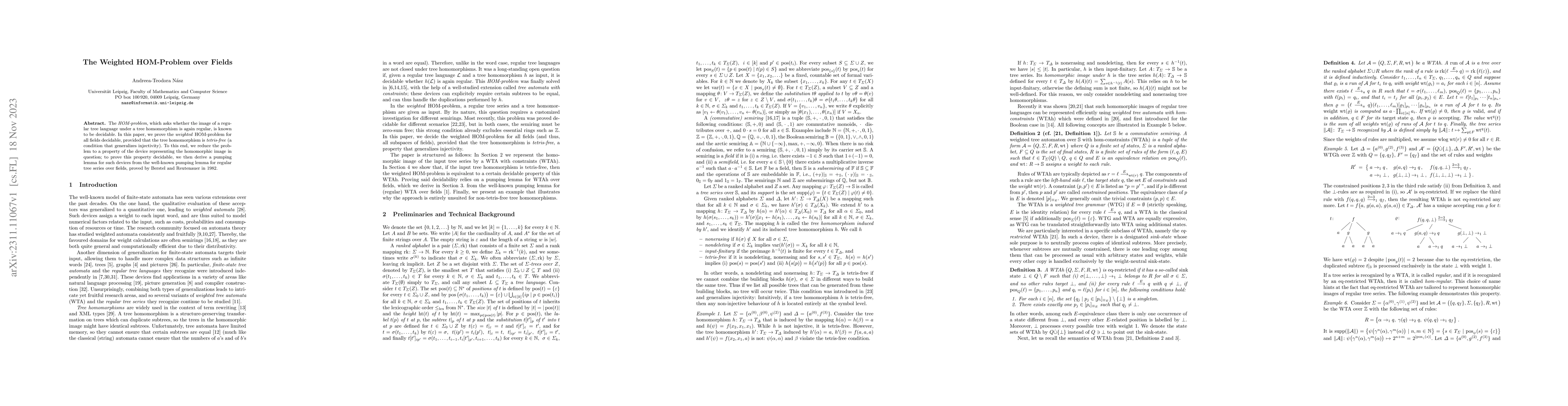 This paper proves the decidability of the weighted HOM-problem over fields under tetris-free tree homomorphisms. It achieves this by reducing the problem to a decidable property of the homomorphic image, leveraging a derived pumping lemma from the classical result by Berstel and Reutenauer.
