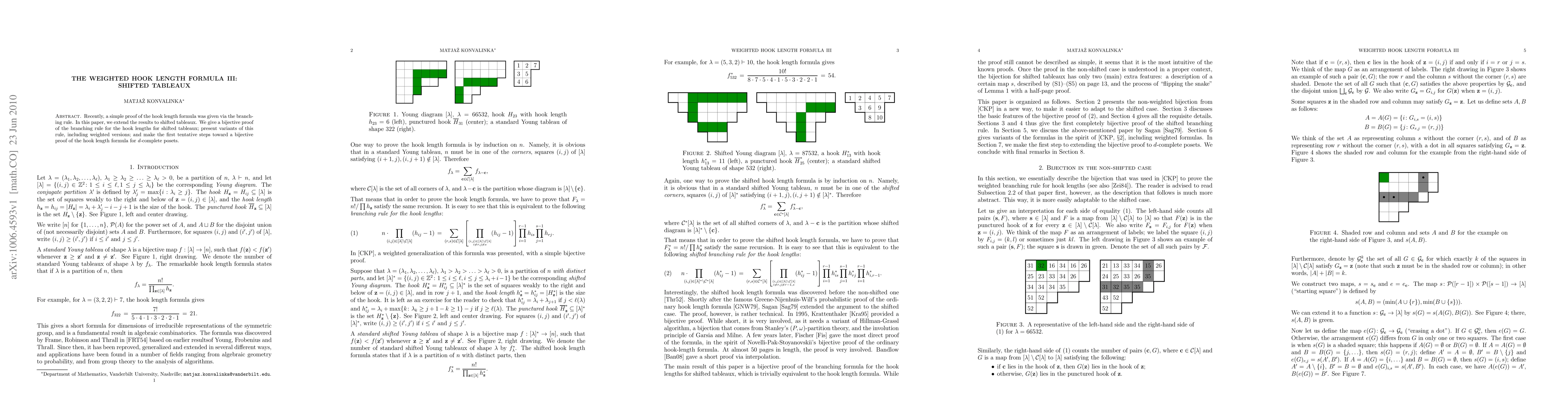 This paper extends the hook length formula to shifted tableaux, providing a bijective proof of the branching rule and introducing weighted variants. It also initiates efforts towards a bijective proof for the hook length formula in d-complete posets.