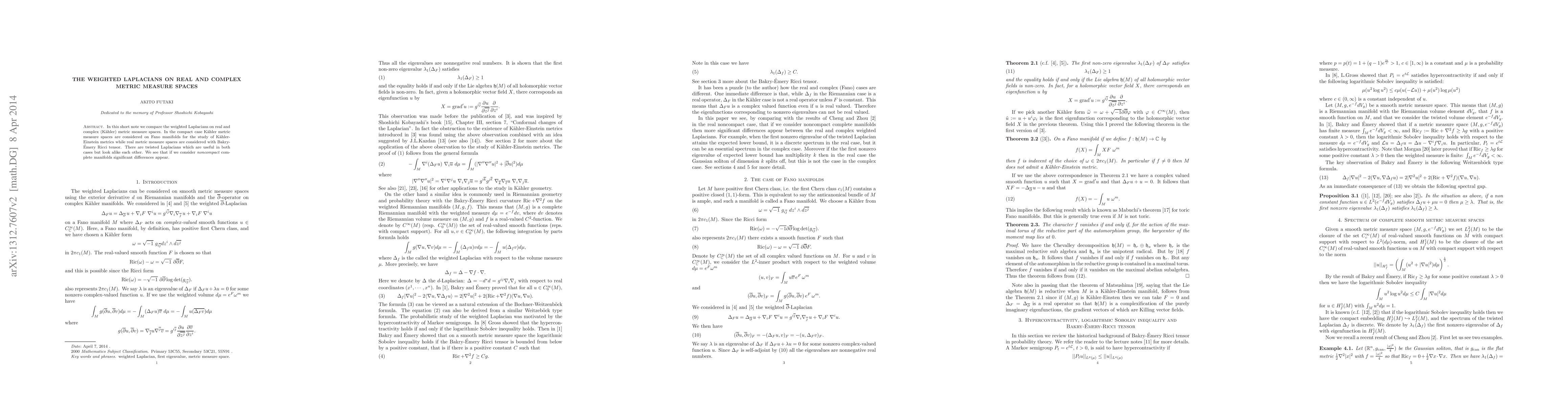 This paper compares the weighted Laplacians on real and complex (Kähler) metric measure spaces, highlighting similarities in compact cases and noting significant differences for noncompact complete manifolds. It focuses on Kähler spaces on Fano manifolds and real spaces with Bakry-Émery Ricci tensor.