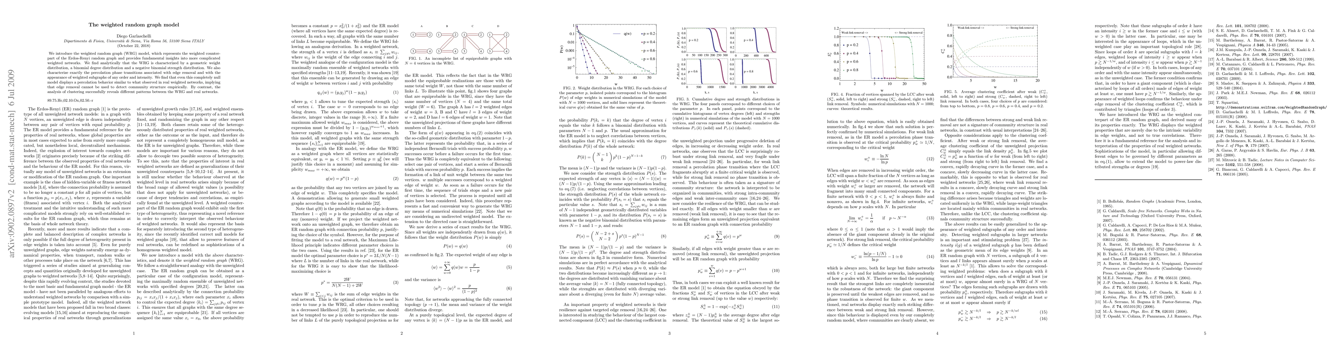 The weighted random graph model reveals a geometric weight distribution, binomial degree distribution, and negative binomial strength distribution, showing percolation behavior similar to real networks, but differing in clustering patterns.