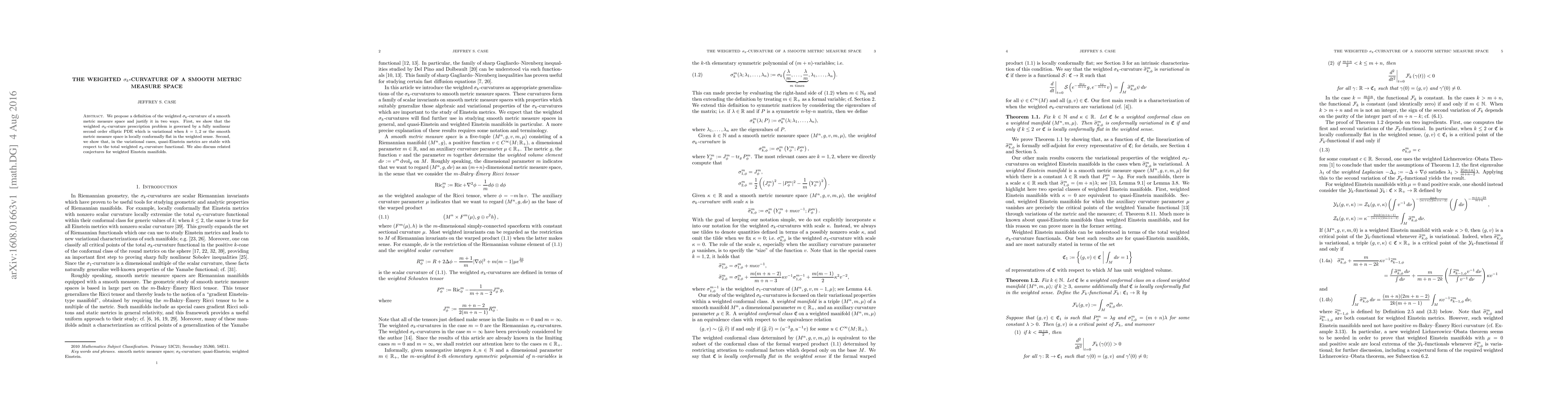 We propose a definition of the weighted $\sigma_k$-curvature of a smooth metric measure space and justify it in two ways. First, we show that the weighted $\sigma_k$-curvature prescription problem is governed by a fully nonlinear second order elliptic PDE which is variational when $k=1,2$ or the smooth metric measure space is locally conformally flat in the weighted sense. Second, we show that, in the variational cases, quasi-Einstein metrics are stable with respect to the total weighted $\sigma_k$-curvature functional. We also discuss related conjectures for weighted Einstein manifolds.