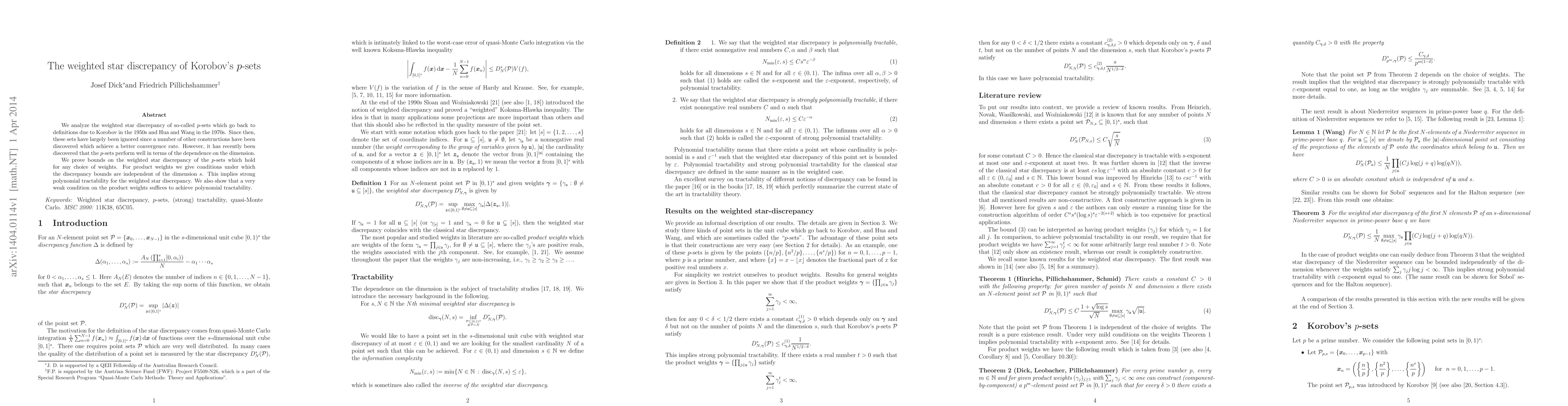 This paper analyzes the weighted star discrepancy of Korobov's $p$-sets, demonstrating strong polynomial tractability under certain conditions. It proves bounds that are independent of the dimension for product weights, highlighting the sets' effectiveness despite being overshadowed by newer constructions.