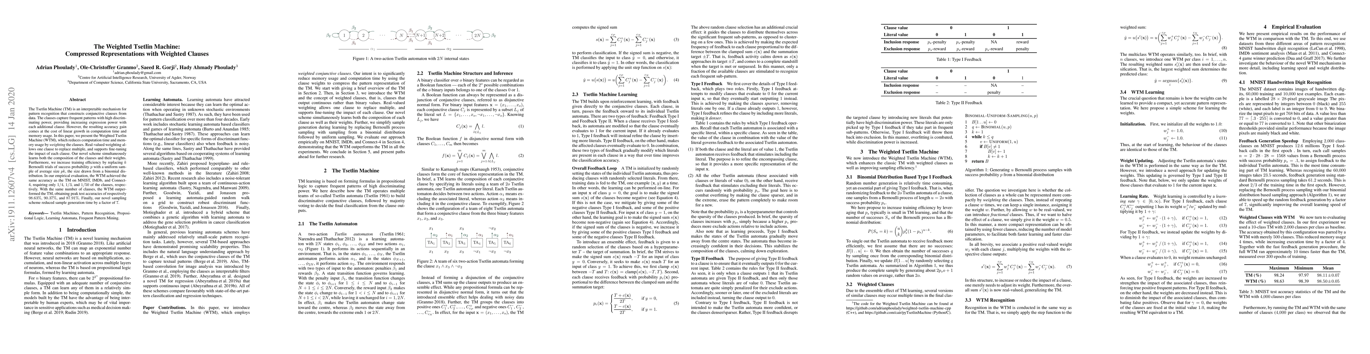 The Weighted Tsetlin Machine (WTM) introduces real-valued weights to Tsetlin Machine clauses to reduce computation time and memory usage while maintaining or improving accuracy. The WTM achieves comparable or superior performance to the standard Tsetlin Machine on various datasets with significantly fewer clauses.
