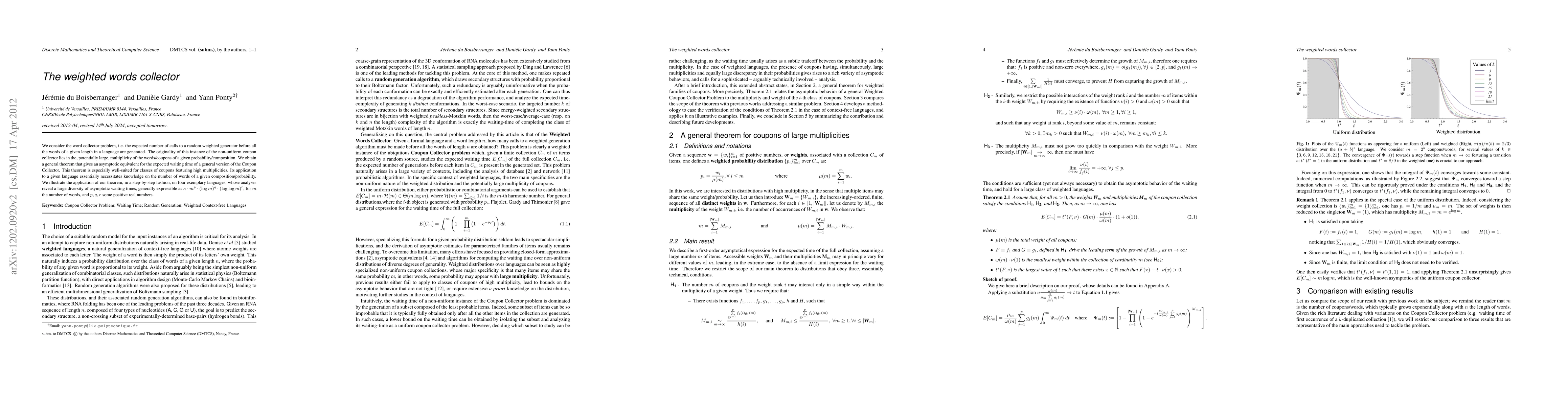 Motivated by applications in bioinformatics, we consider the word collector problem, i.e. the expected number of calls to a random weighted generator of words of length $n$ before the full collection is obtained. The originality of this instance of the non-uniform coupon collector lies in the, potentially large, multiplicity of the words/coupons of a given probability/composition. We obtain a general theorem that gives an asymptotic equivalent for the expected waiting time of a general version of the Coupon Collector. This theorem is especially well-suited for classes of coupons featuring high multiplicities. Its application to a given language essentially necessitates some knowledge on the number of words of a given composition/probability. We illustrate the application of our theorem, in a step-by-step fashion, on three exemplary languages, revealing asymptotic regimes in $\Theta(\mu(n)\cdot n)$ and $\Theta(\mu(n)\cdot \log n)$, where $\mu(n)$ is the sum of weights over words of length $n$.