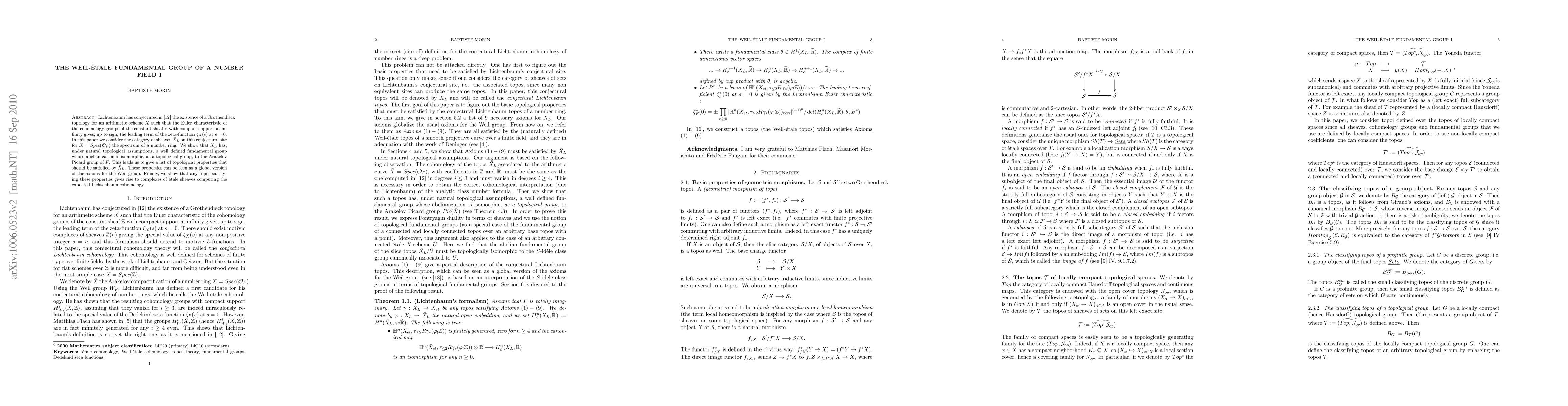 Lichtenbaum has conjectured the existence of a Grothendieck topology for an arithmetic scheme $X$ such that the Euler characteristic of the cohomology groups of the constant sheaf $\mathbb{Z}$ with compact support at infinity gives, up to sign, the leading term of the zeta-function $\zeta_X(s)$ at $s=0$. In this paper we consider the category of sheaves $\bar{X}_L$ on this conjectural site for $X=Spec(\mathcal{O}_F)$ the spectrum of a number ring. We show that $\bar{X}_L$ has, under natural topological assumptions, a well defined fundamental group whose abelianization is isomorphic, as a topological group, to the Arakelov Picard group of $F$. This leads us to give a list of topological properties that should be satisfied by $\bar{X}_L$. These properties can be seen as a global version of the axioms for the Weil group. Finally, we show that any topos satisfying these properties gives rise to complexes of \'etale sheaves computing the expected Lichtenbaum cohomology.