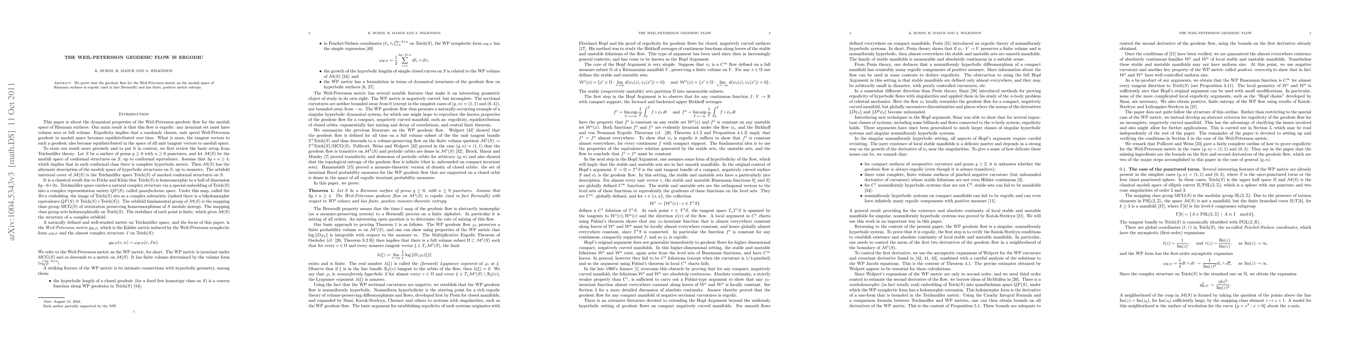 Summary: The paper demonstrates that the geodesic flow on the moduli space of Riemann surfaces, under the Weil-Petersson metric, is ergodic and exhibits finite, positive metric entropy, establishing its Bernoulli nature.