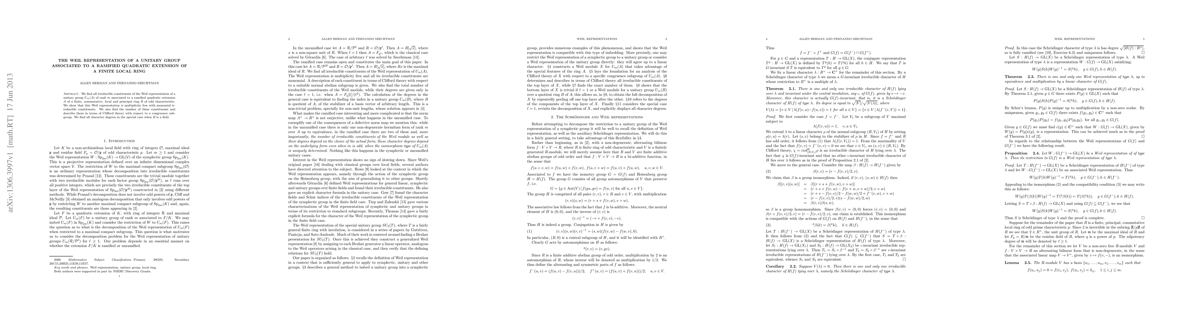 We find all irreducible constituents of the Weil representation of a unitary group $U_m(A)$ of rank $m$ associated to a ramified quadratic extension $A$ of a finite, commutative, local and principal ring $R$ of odd characteristic. We show that this Weil representation is multiplicity free with monomial irreducible constituents. We also find the number of these constituents and describe them in terms of Clifford theory with respect to a congruence subgroup. We find all character degrees in the special case when $R$ is a field.