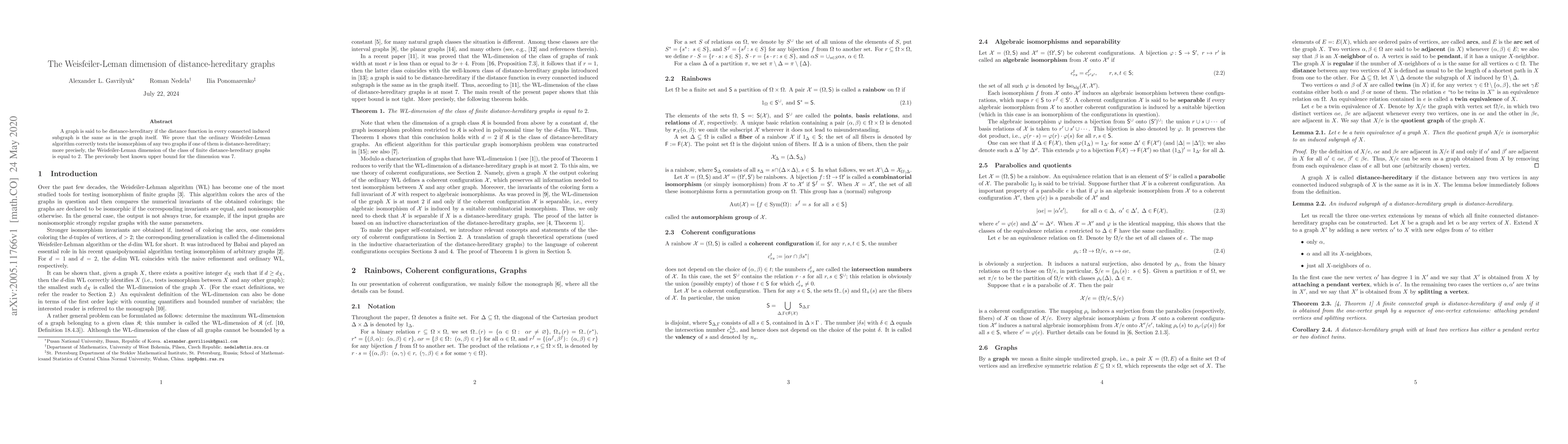 The paper proves that the Weisfeiler-Leman algorithm can correctly determine the isomorphism of graphs where one is distance-hereditary, establishing the Weisfeiler-Leman dimension for this class as $2$, which is an improvement over the previously best known upper bound of $7$.